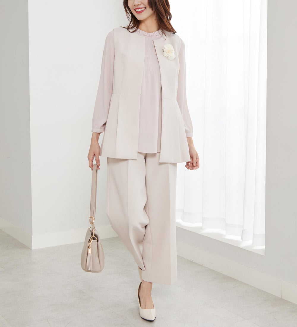 「〈C/S〉ノーカラージャケット」、「〈C/S〉ノーカラーペプラムジレ」、「〈C/S〉センタータックテーパードパンツ」、「〈C/S〉センタータックワイドパンツ」の4アイテムは、同素材で揃えられるため、オケージョンにも対応するセットアップスタイルを簡単に完成させることができます。体のラインを拾いにくく、上品で洗練された印象を演出します。さらに、ご自宅の洗濯機で手軽にお手入れできるため、忙しい日常にも寄り添う便利な一着です。