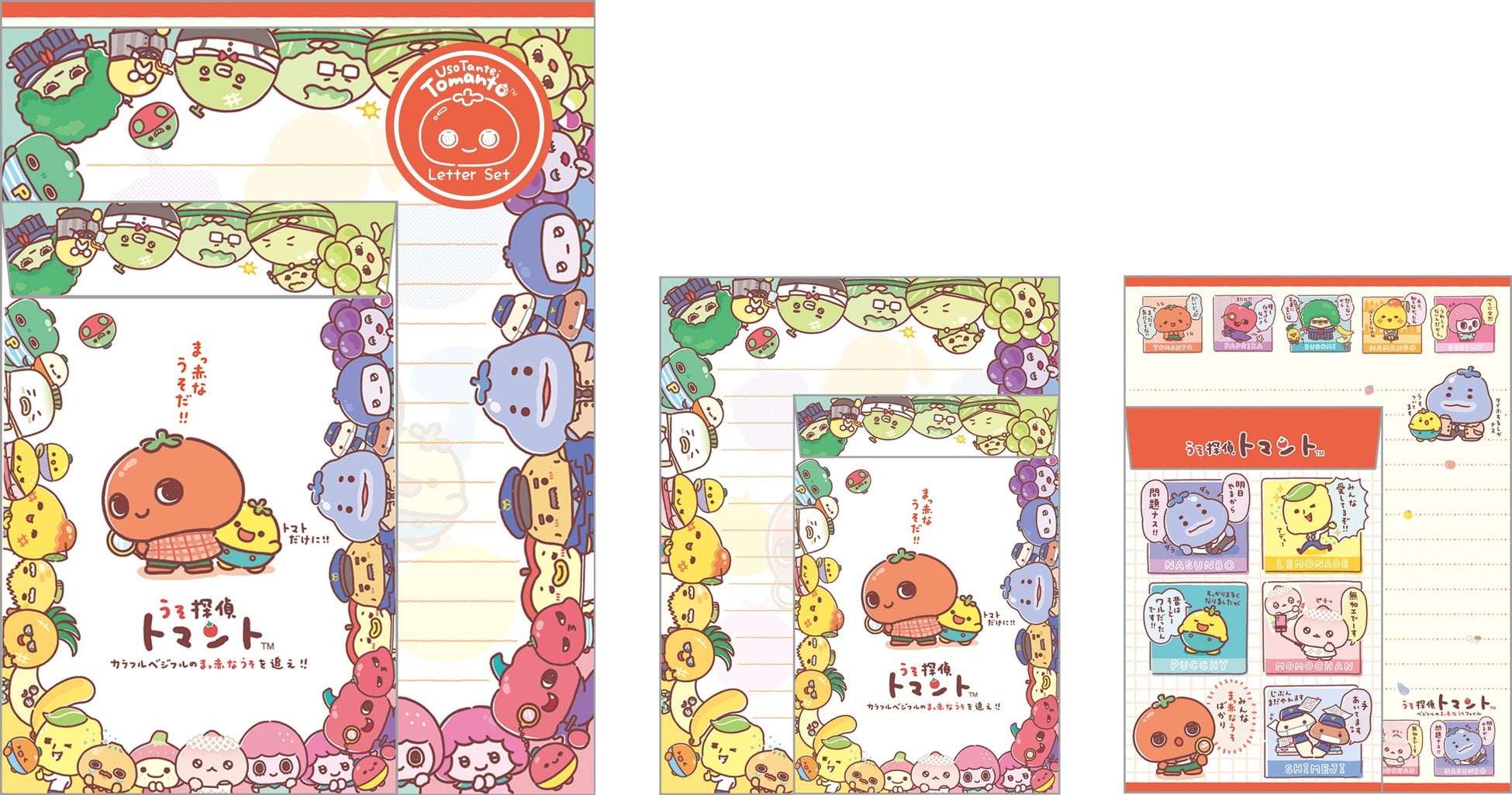 メモパッドやレターセット、クリアホルダーなどの文具や、ミニタオル、ポーチ、巾着、トートバッグなどの縫製品、そして、全部で30以上ものキャラクターたちがいる「うそ探偵トマント」ならではの、個性豊かなキャラたちがアイテムになったステッカー、アクリルスタンド、アクリルキーホルダー、ぬいぐるみなどが登場します。