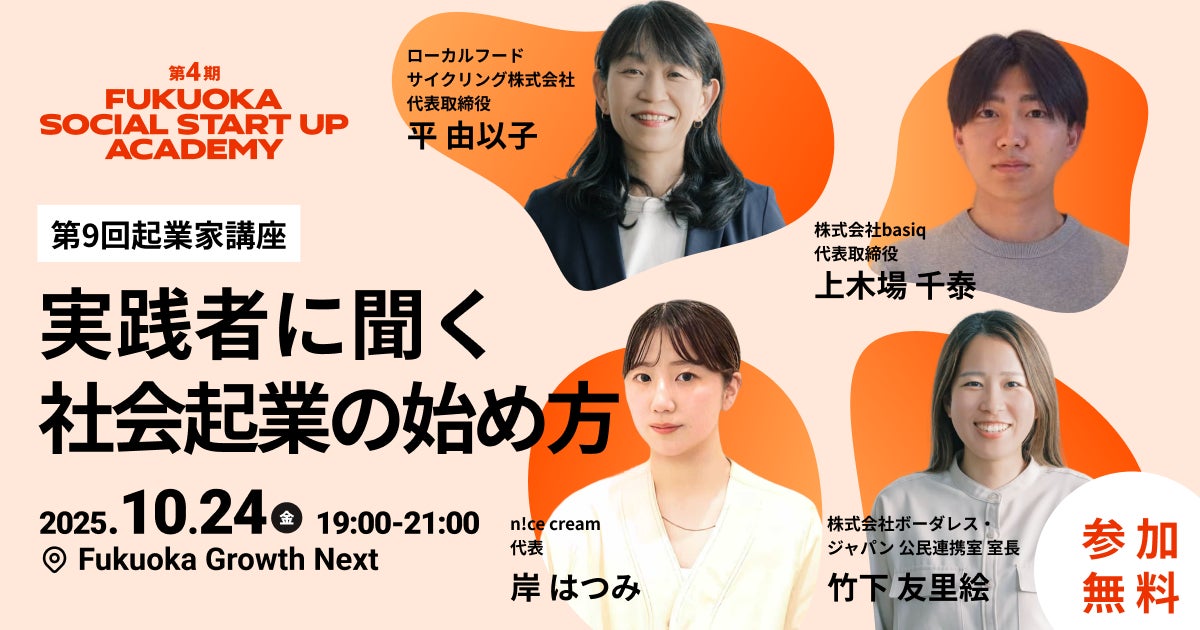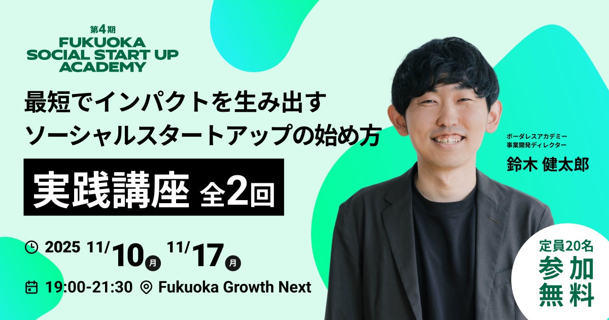世界14カ国で50以上のソーシャルビジネスを展開する株式会社ボーダレス・ジャパン(本社:福岡県福岡市、代表取締役CEO:田口 一成、以下 ボーダレス・ジャパン)と福岡市の官民共働型スタートアップ支援施設「Fukuoka Growth Next」(所在地:福岡県福岡市、以下FGN)は、約2ヶ月間を通じて社会課題解決につながるビジネスアイデアのベースを作る社会起業プログラム「FUKUOKA SOCIAL START UP ACADEMY」(以下本プログラム)の第4期を2025年10月より開講することを発表します。