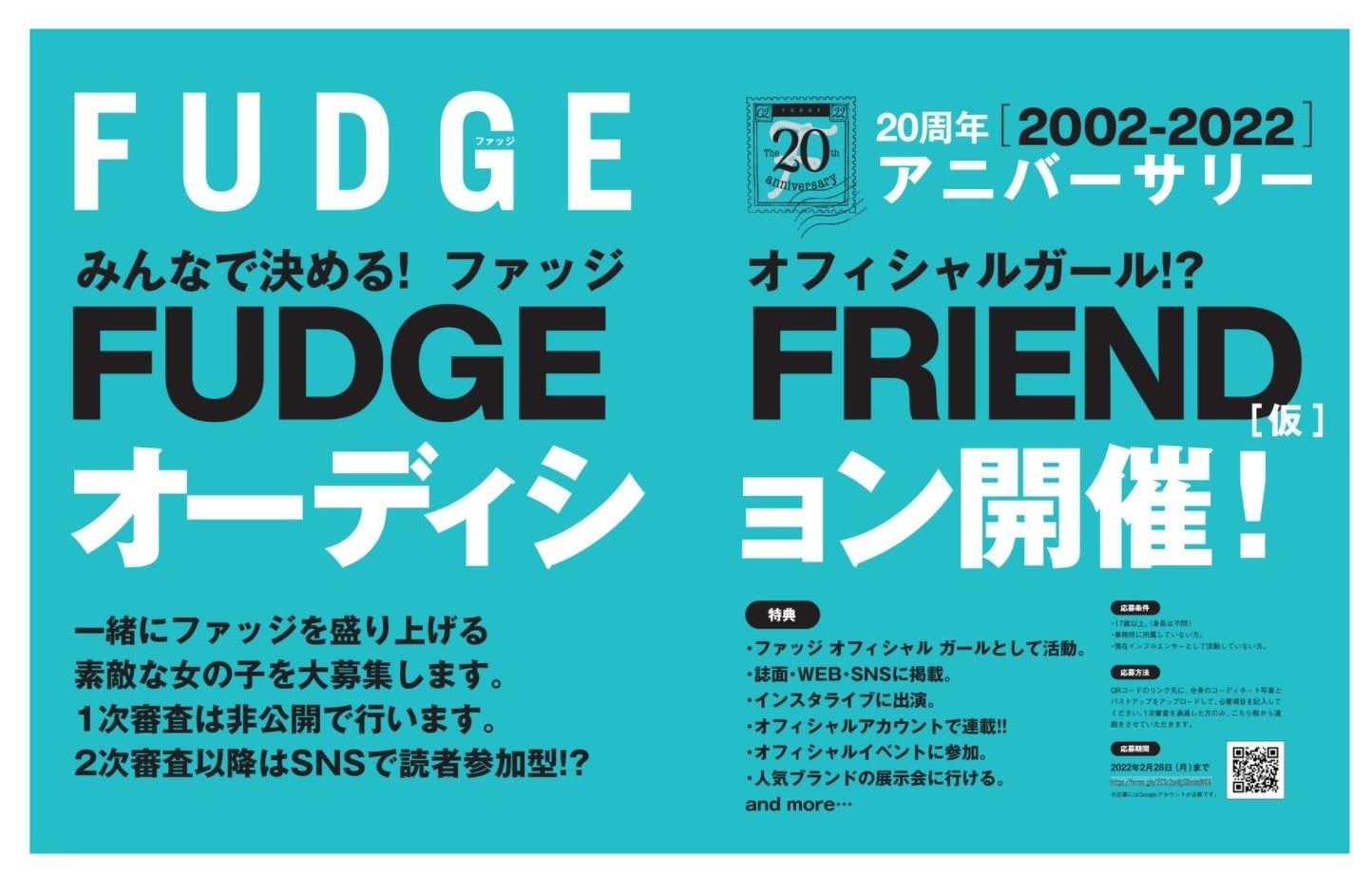 2022年に創刊20周年を迎えるFUDGE。そんなFUDGEをこれから一緒に盛り上げてくれる素敵な女の子を大募集します!詳細はFUDGE 2022年2月号 P152~P153をチェック!