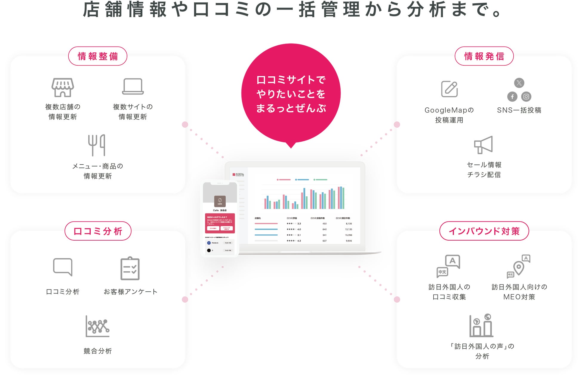 口コミコムは、国内外の口コミサイトを”もっと”売上に変える「口コミサイトの一括管理ツール」です。口コミの情報を活かした店舗改善やGoogleマップ・口コミサイトからの集客数増加を支援します。