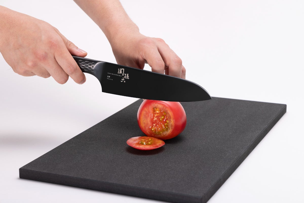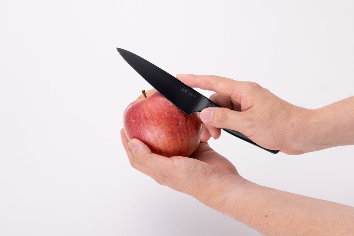 今回新しく登場した「関孫六 匠創-漆黒」は、ペティ、三徳、シェフナイフの3種類のラインナップをご用意しております。「匠創」の本体構造をベースに、さらに黒チタンコーティングを施すことでサビに強く、より衛生的で高級感あふれる商品となっています。高級感のあるデザインは、近年人気な黒基調のキッチンや家電との一体感も抜群であり、男性のご利用やギフトにもぴったりです。