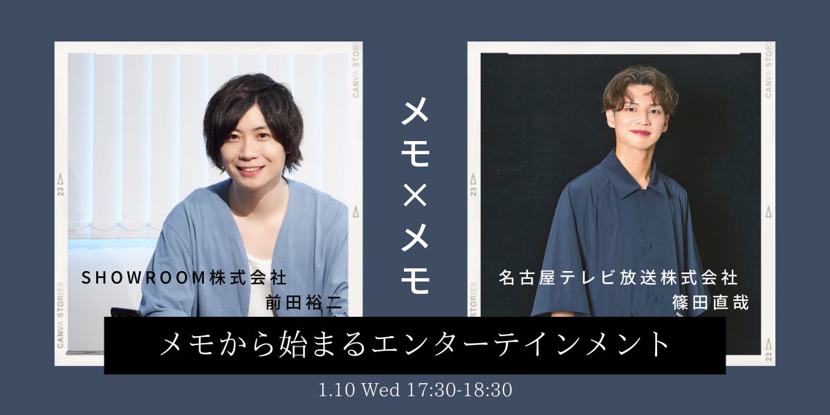 2024年1月10日(水)にCOLORS.366 2F「納屋橋劇場」(愛知県名古屋市中区栄1丁目1-5)にてSHOWROOM株式会社(本社:東京都渋谷区)代表取締役社長 前田裕二と、名古屋テレビ放送(本社:愛知県名古屋市中区 ※以下メ〜テレ)コンテンツプロデュース部 篠田直哉 ディレクターによる、「メモの魔力」×「メモ少年」コラボトークイベント “メモから始まるエンターテインメント”の開催が決定しました。