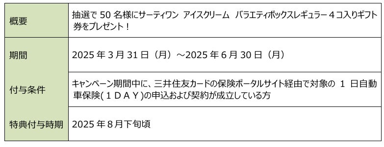 また、今回の販売開始に合わせて、三井住友カードは「サーティワン アイスクリーム バラエティボックスレギュラー4コ入りギフト券」が抽選で当たるキャンペーンを実施いたします。自動車でお出かけの際にはぜひこの機会にVポイントが貯まる「1日自動車保険(1DAY)」をご利用ください。