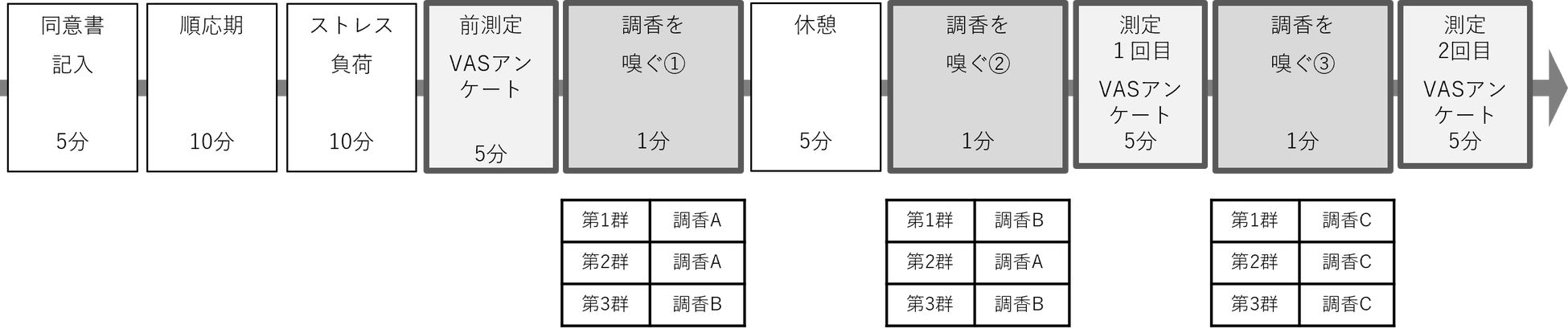 第1群~3群に、下記の通り調香を順に嗅がせ、心身状態の変化をVAS法により調査。