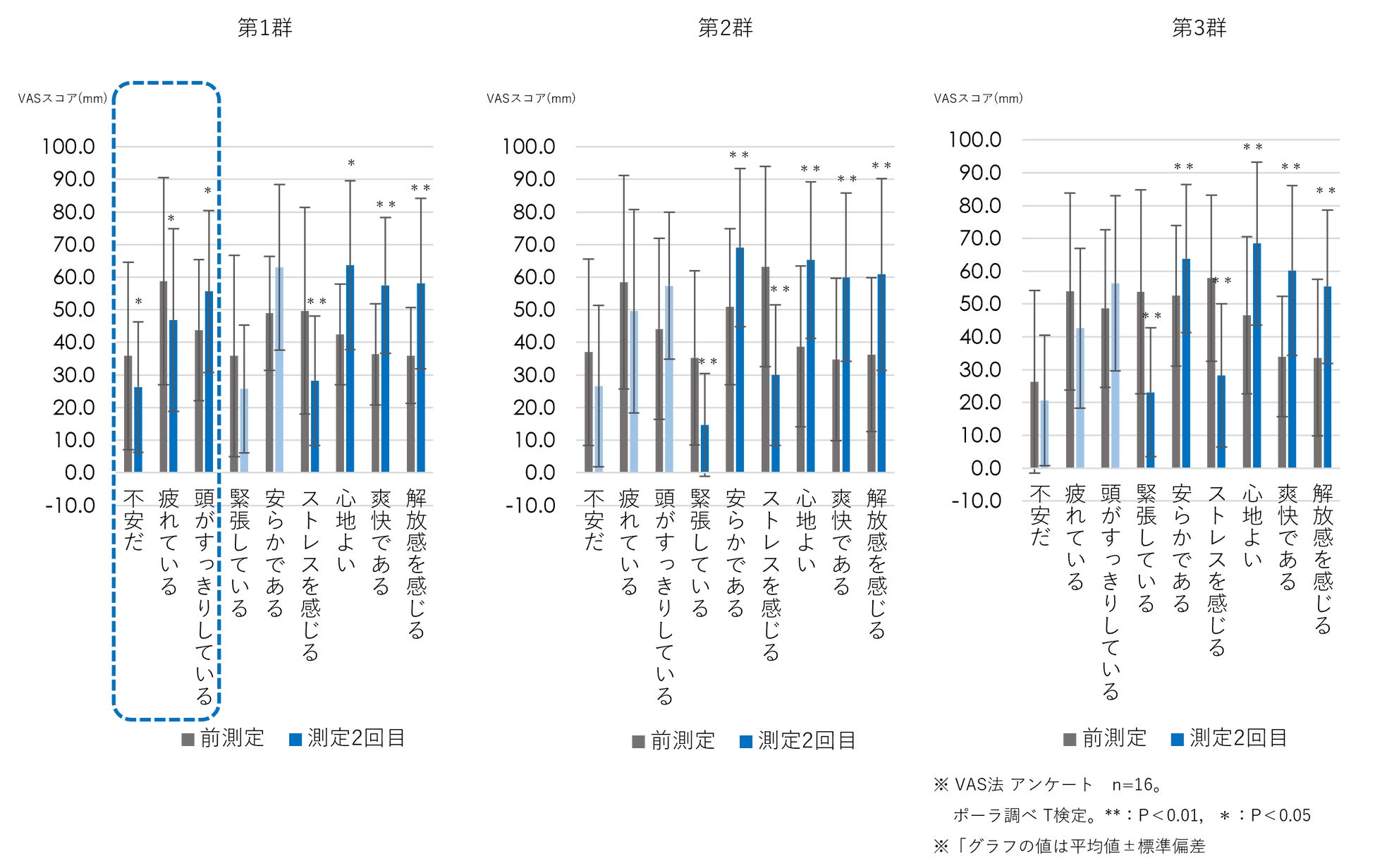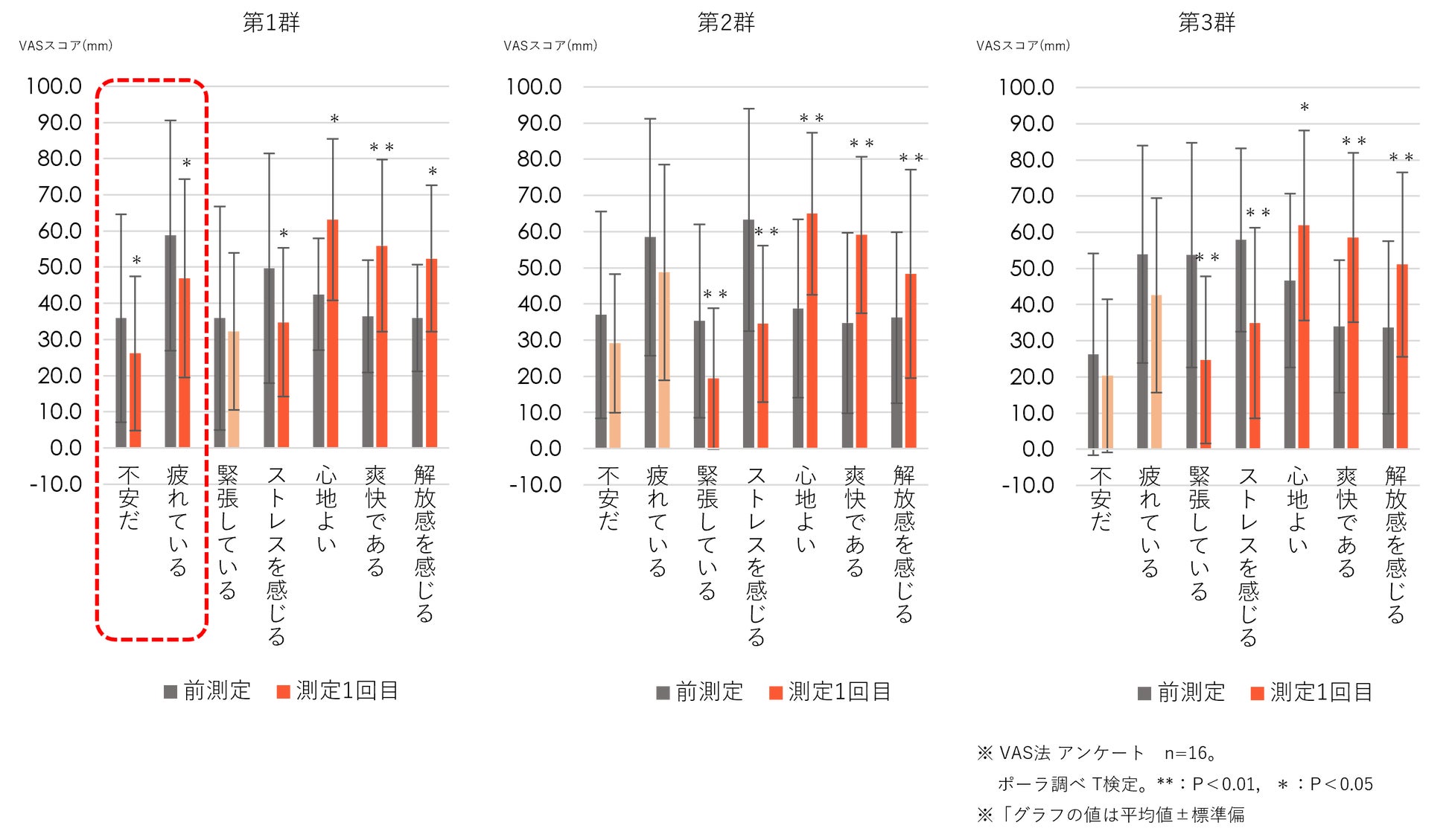 また、全ての群で「ストレスを感じる」は低下し、「心地よい」「爽快である」 「解放感を感じる」は増加する結果となりました。