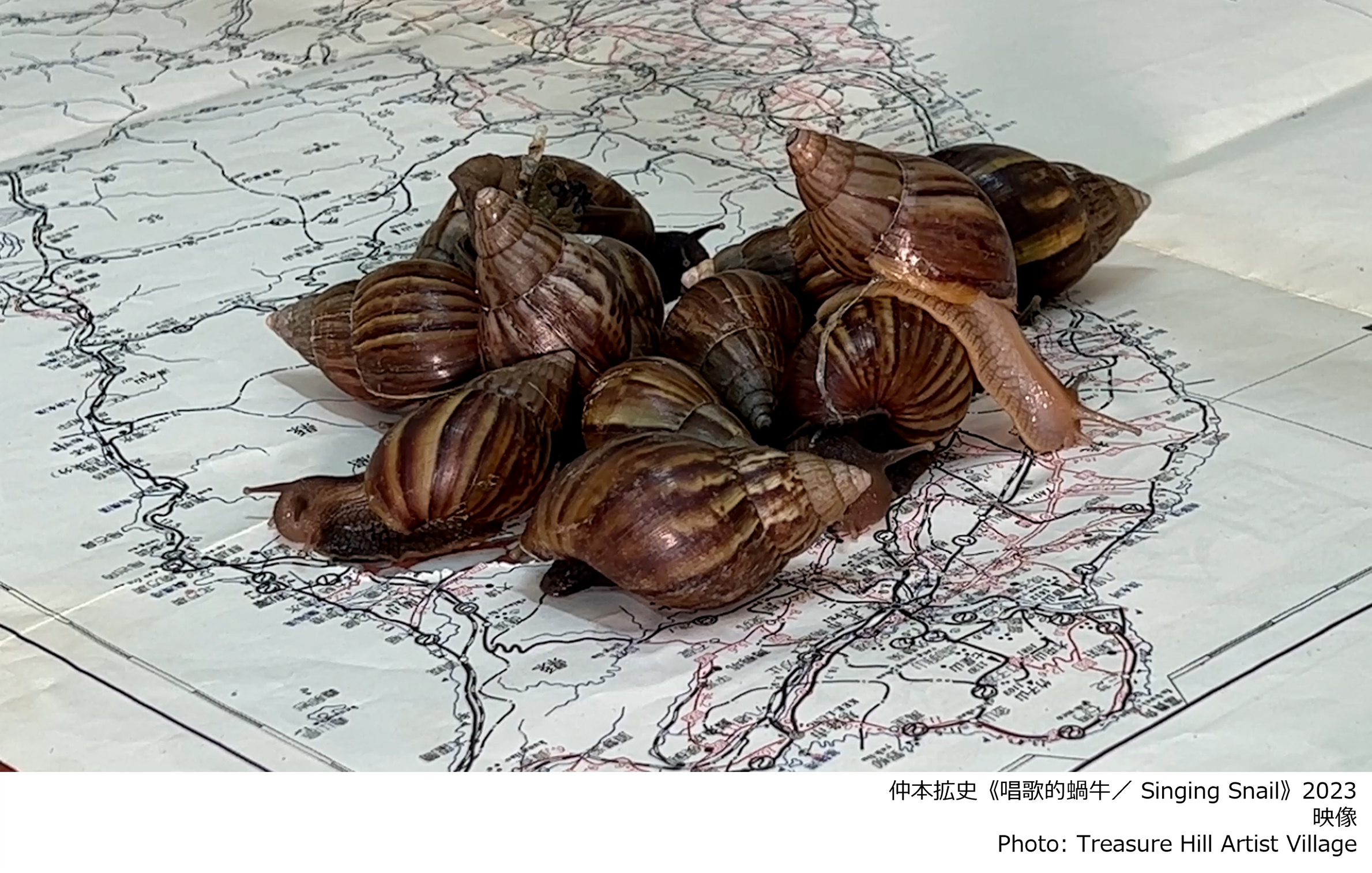 土地へのリサーチにもとづいて映画・映像の制作を行ってきた仲本は、台湾の動植物の生態や民話、歴史をリサーチしました。本展では、滞在先のレジデンスに生息するカタツムリをとおして、自身が幼少期を過ごしたミャンマーでの思い出に、台湾のカタツムリの歴史、そして沖縄のヤドカリとの関係を繋ぐ映像作品を発表します。