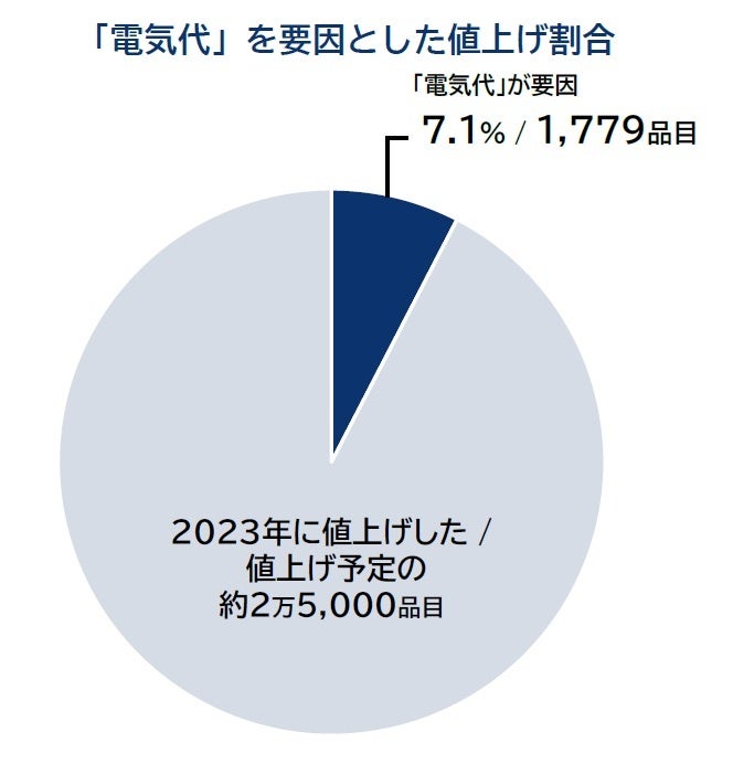 食品メーカー各社による値上げのなかで、「電気代」の上昇が新たな値上げ圧力として台頭しつつあることが分かった。23年以降の国内の主要な食品や飲料メーカー195社・約2万5000品目の値上げデータを基に分析したところ、全体の7.1%・1779品目で「電気・ガス代(電気代)の上昇」が値上げの主な理由だったことが判明した。