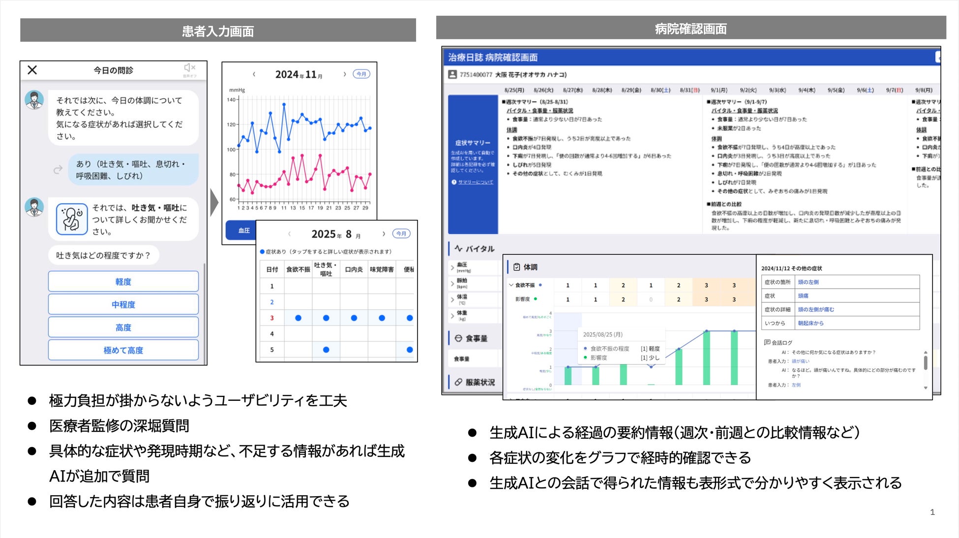 問診生成AIでは、患者さんやそのご家族がスマートフォンやタブレット、PCといった自身が所有するデバイスで、人工知能(AI)アバターとのチャットを通じて、日々の体調を簡単に入力できます。音声入力にも対応しているので、副作用の影響で文字入力が困難な場合でも記録が可能です。さらに、生成AIによる会話形式の問診によって、規定項目に加え、患者さんに過度な負担をかけることなく、体調不良時の状況や規定項目以外の症状についても引き出すことができます。患者さんによって確認された入力内容はシームレスに電子カルテ端末で参照でき、グラフ表示や週ごとのサマリー、前週との比較といった機能で整理されるため、医療従事者は一元化された情報として確認できます。本ソリューションは、構築にあたって、医師・看護師・薬剤師と十分な議論を重ねたことにより、がん化学療法の現場で役立つ実践的な問診が可能となっています。また、問診生成AIを通じて、大阪国際がんセンターの全ての患者さんを対象に、これまで紙媒体で運用されていた初診時の問診票を電子化し、電子カルテに連携する取り組みも実施しています。