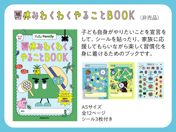 お子さまは、シールを貼ることでやることを習慣化し、家族で夏休みに楽しめるブックとなっております。ハロファミアプリをこの機会にご利用ください。