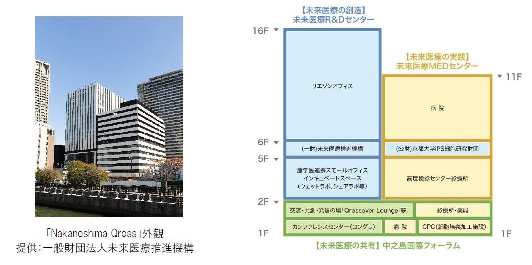 「Nakanoshima Qross」 は、医療機関と企業、スタートアップ、支援機関等が一つ屋根の下に集積する他に類を見ない未来医療の産業化拠点です。2019年に21社の民間企業等と大阪府で設立され、一般財団法人未来医療推進機構が核となり拠点形成を進めています。本拠点は、「未来医療 MED センター」「未来医療 R&D センター」「中之島国際フォーラム」の3つの施設(エリア)で構成されており、それぞれ未来医療の「実践」「創造」「共有」の役割を持っています。入居する企業や医療機関等がそれぞれ連携することで、「実践」「創造」「共有」の役割をサイクルさせ、再生医療をベースに、ゲノム医療や人工知能(AI)、IoTの活用等、今後の医療技術の進歩に即応した最先端の「未来医療」における産業化を推進させること、及び国内外の患者に対する「未来医療」の提供を通じて、国際貢献を推進させることをめざします。