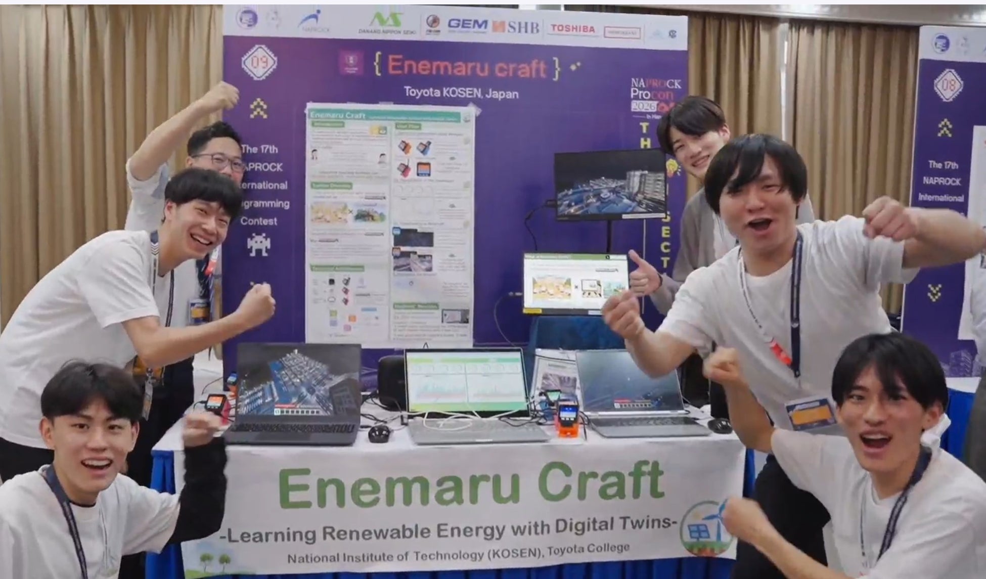 本大会には日本・ベトナム・モンゴル・タイの4か国から国内大会よりノミネートされた36チーム114名の学生が参加し、ICT技術を活用した社会課題解決型ソフトウェアの開発を競いました。豊田高専チーム 「エネまるクラフト(Enemaru Craft)」 は、再生可能エネルギーや環境教育をテーマとしたICTシステムを提案し、技術力・独創性・社会的有用性・完成度などが総合的に評価され、課題部門において世界一となる Grand Prize を受賞しました。