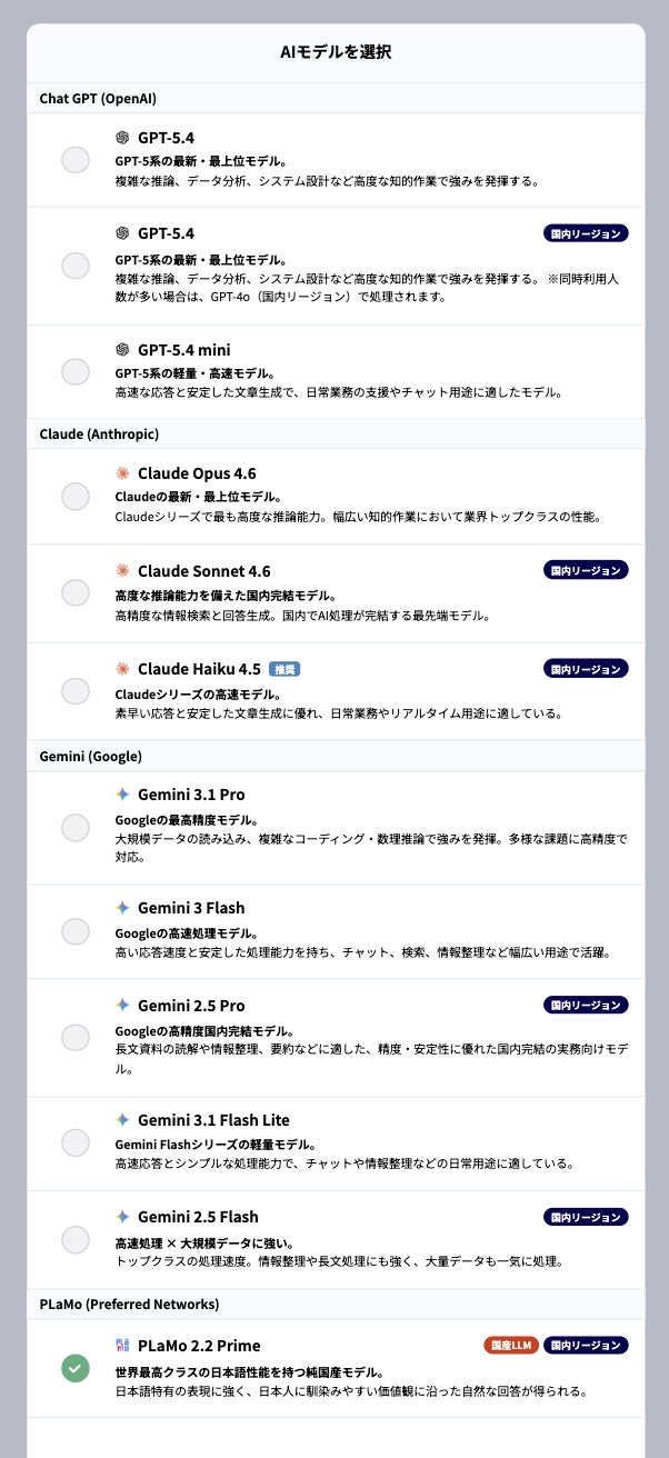 OpenAI・Anthropic・Google・Preferred Networksの主要4社から厳選した12モデルを搭載し、用途に応じて最適なAIを選択できる環境を提供しています。