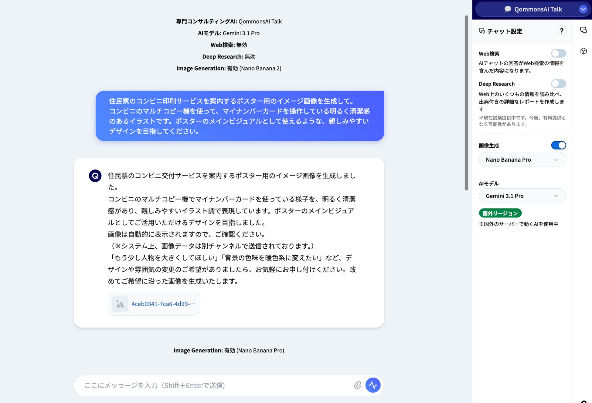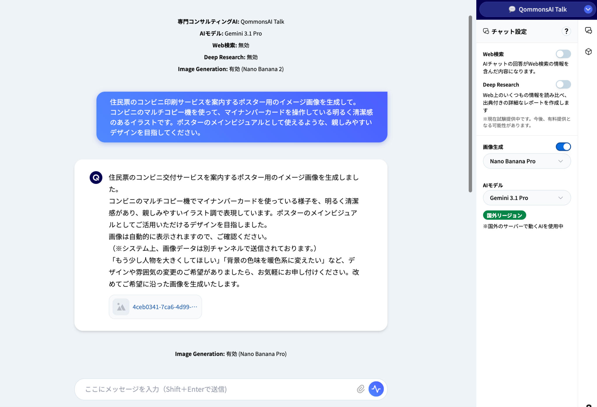 「Nano Banana 2」「Nano Banana Pro」「GPT Image 1.5」の3モデルを搭載しました。Nano Banana 2は4K解像度・多言語テキスト描画・SynthID電子透かし自動付与に対応。広報ポスターやチラシの素案を、AIが数秒で生成します。デザイン会社に外注していた作業が、庁内で完結する時代がやってきました。