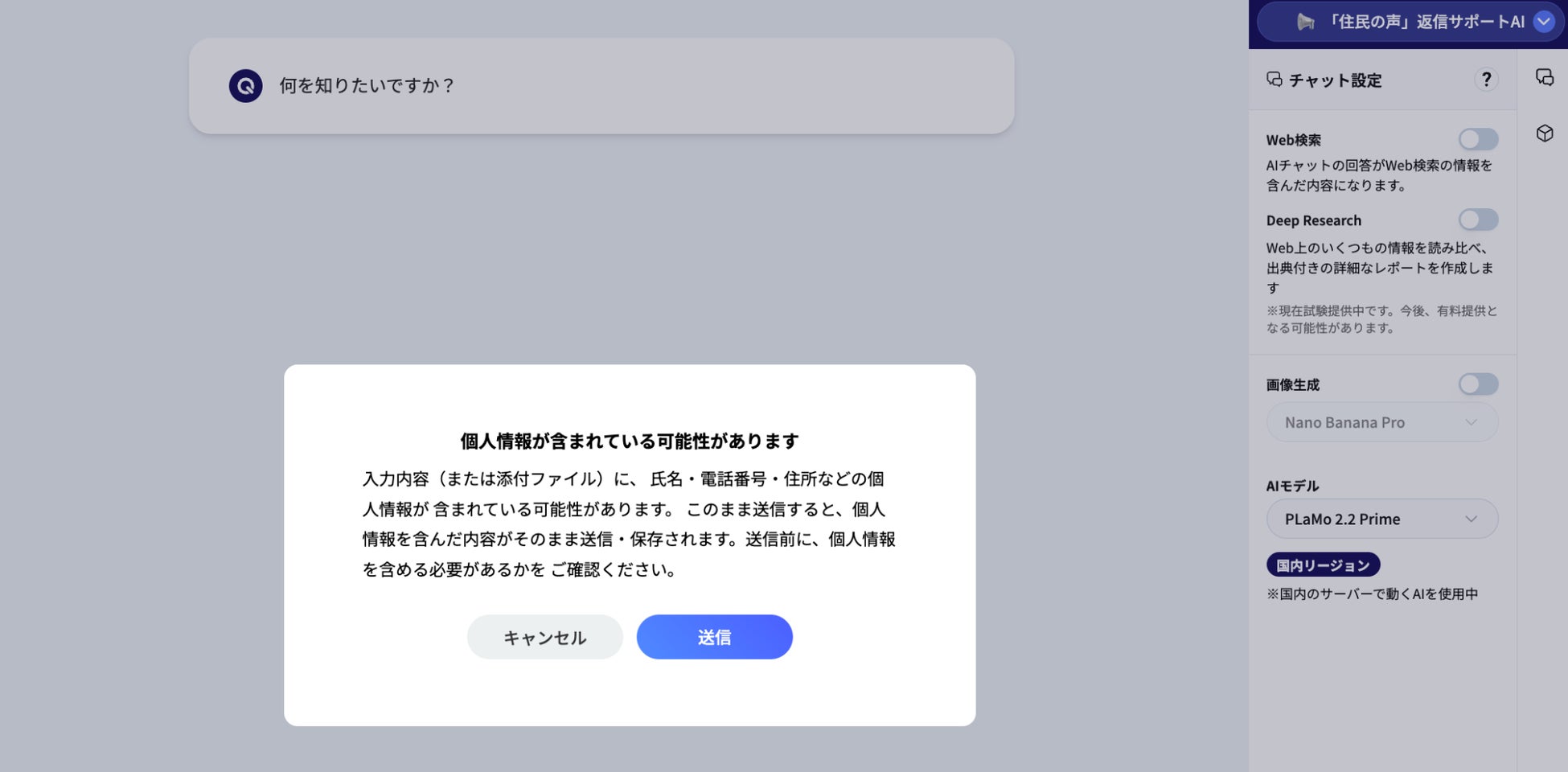 ④ 個人情報の自動検知・禁止ワードブロック・検知ログの3層防御を搭載 ― 「使わせたいが、漏らさせない」情報ガバナンスをAIの力で実現