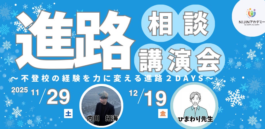 株式会社NIJIN(本社:東京都江東区、代表取締役:星野達郎)が運営する不登校オルタナティブスクール『NIJINアカデミー』は、2025年11月29日(土)および12月19日(金)の2日間にわたり、不登校の経験を持つお子様とその保護者を対象とした特別オンラインイベント「\一歩踏み出す冬!不登校の経験を力に変える「進路選択」を考える2DAYS/」を開催いたします。