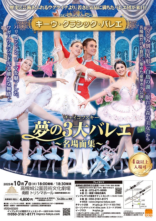 令和7年10月7日(火曜日)、高槻城公園芸術文化劇場で、世界各国で公演を行ってバレエ芸術の素晴らしさを伝え続けるウクライナのバレエ団「キーウ・クラシック・バレエ」が、同団で圧倒的人気を誇る作品「チャイコフスキー夢の3大バレエ」を上演。3大クラシックバレエと言われる「くるみ割り人形」「白鳥の湖」「眠れる森の美女」の名場面ばかりを集めて観客の皆さまにお届けします。