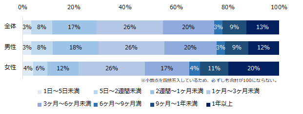 続いて「男性が育休を取得する際、妥当な期間はどのくらいだと思いますか?」と伺うと、「1ヵ月~3ヵ月未満」が26%で最多に。男女別で見ると、最多は「1ヵ月~3ヵ月」が26%で共通でしたが、2番目に多い回答は男女間で異なる結果に。男性は「3ヵ月~6ヵ月」(20%)、女性は「1年以上」(20%)と、妥当だと思う育休取得期間に男女差が見られました。