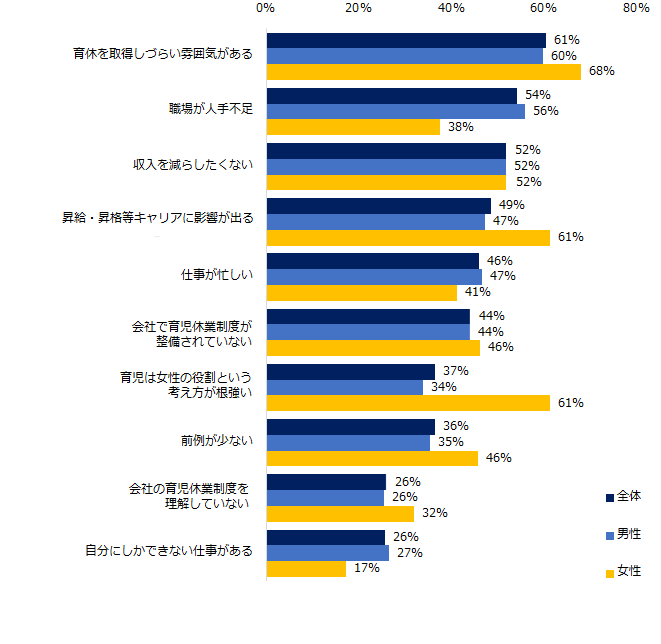 男性育休の取得率が低い理由を伺うと、トップは「育休を取得しづらい雰囲気がある」(61%)でした。次いで「職場が人手不足」(54%)、「収入を減らしたくない」(52%)が続きます。最も男女差があった回答は「育児は女性の役割という考え方が根強い」で27ポイントの差が開きました(男性:34%、女性:61%)。