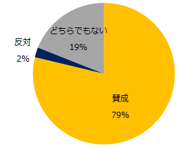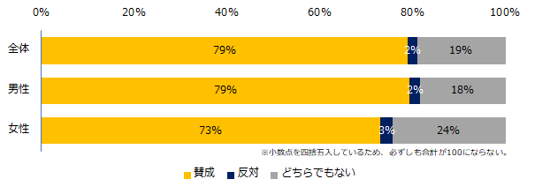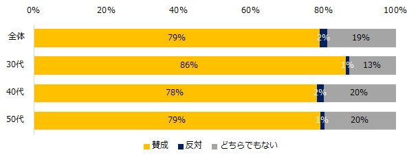 「男性が育休を取得することについて賛成ですか、反対ですか? 」と伺うと、79%が「賛成」と回答しました。年代別では30代が、男女別では男性のほうが「賛成」の割合が若干多い結果となりましたが、年代別、男女別ともに大きな差は見られませんでした。
