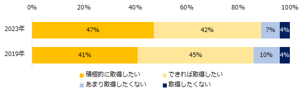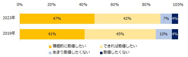 男性に「もしこれからお子さんが生まれるとしたら、育休を取得したいと思いますか? 」と伺うと、89%が「取得したい」(積極的に取得したい:47%、できれば取得したい:42%)と回答しました。2019年の同調査と比較すると「積極的に取得したい」の回答単体では6%増加と、微増の結果となりました。