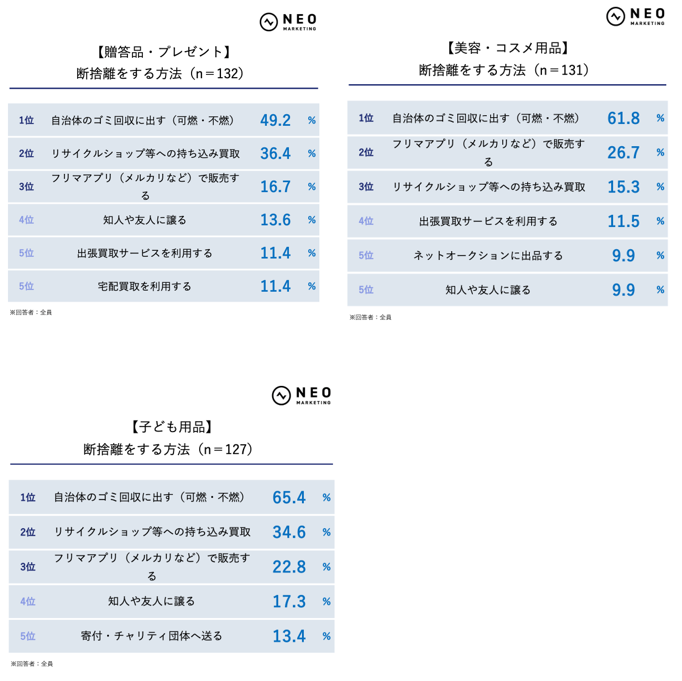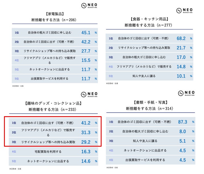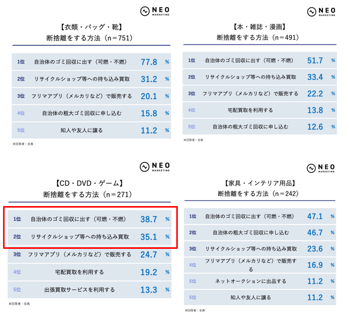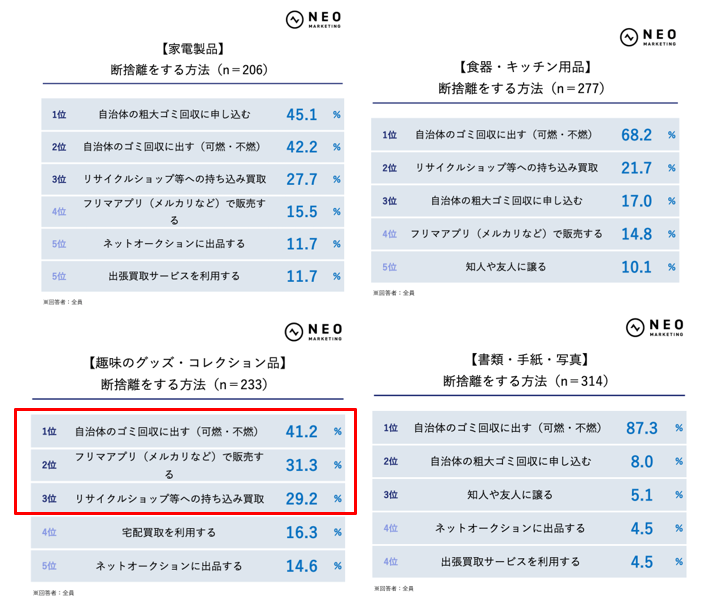 断捨離の方法は、どのジャンルでもまず「自治体のゴミ回収に出す」がトップでした。