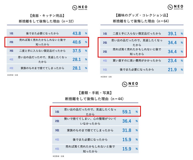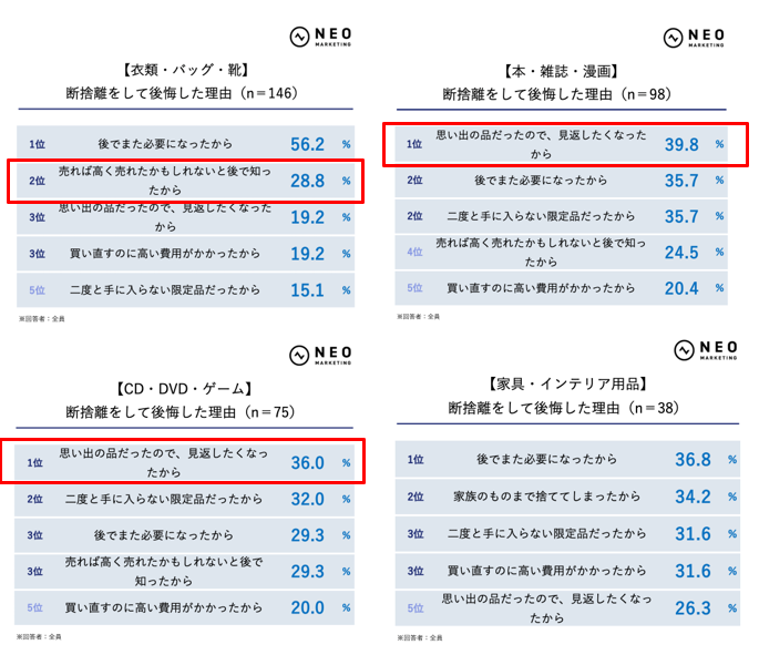 一方、本・雑誌・漫画やCD・DVD・ゲーム、趣味のグッズ・コレクション品、書類・手紙・写真では、「思い出の品だったので、見返したくなったから」が上位に。情報や記録、思い出が残るものほど後悔につながりやすい傾向です。