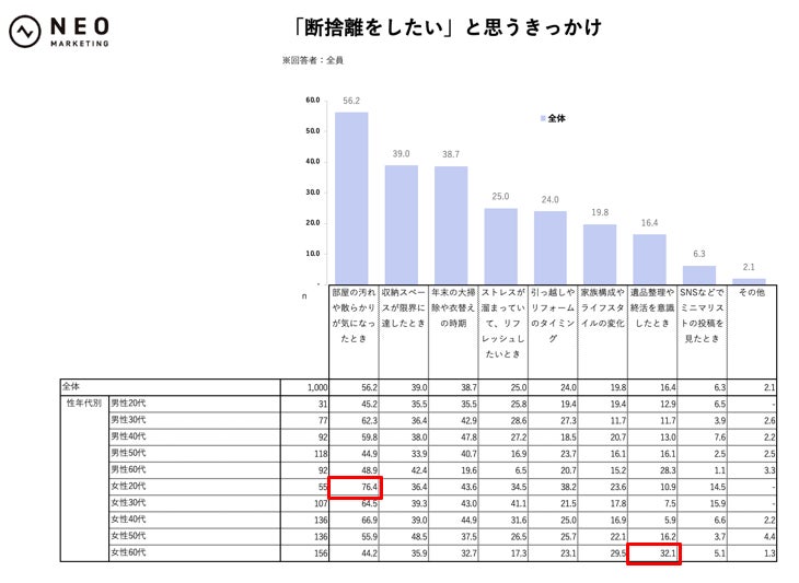全体では、「断捨離をしたい」と思うきっかけとして「部屋の汚れや散らかりが気になったとき」が56.2%で突出し、「収納スペースが限界に達したとき」39.0%、「年末の大掃除や衣替えの時期」38.7%が続きました。