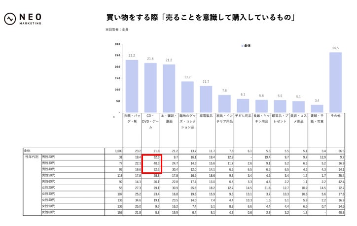 全体で「売ることを意識して購入しているもの」として最も多かったのは「衣類・バッグ・靴」23.2%で、次いで「CD・DVD・ゲーム」21.8%、「本・雑誌・漫画」21.2%でした。