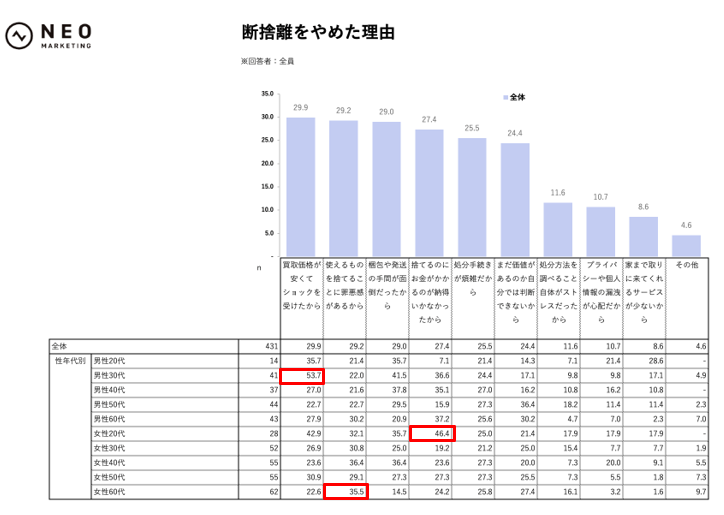 断捨離をやめた理由は、全体では「買取価格が安くてショックを受けたから」29.9%が最多で、「使えるものを捨てることに罪悪感があるから」29.2%、「梱包や発送の手間が面倒だったから」29.0%がほぼ並びました。単に処分が進まないというより、「値段への納得感」「まだ使えるものを手放す心理的抵抗」「手間」の3つが、断捨離のストッパーになっているようです。