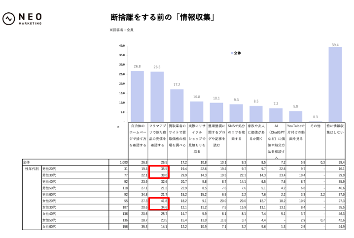 全国の20歳以上の男女1,000人に聞いた。捨てる前に調べる、が新常識。全体の約60%が断捨離前に情報収集。若年層ほどSNS、AI、YouTubeなど複数手段を横断する傾向