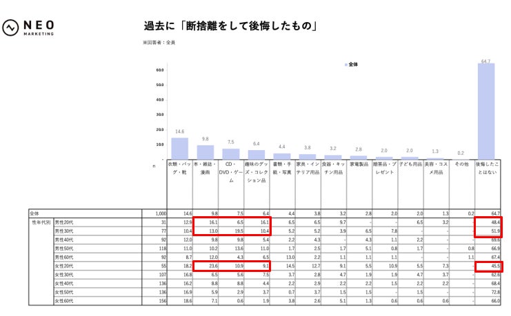 性年代別では、女性20代の「後悔したことはない」が45.5%、男性20代48.4%、男性30代51.9%と相対的に低く、若い層ほど「本・雑誌・漫画」や「CD・DVD・ゲーム」「趣味のグッズ・コレクション品」など、思い入れや再取得のしにくさがあるものを後から惜しみやすいようです。