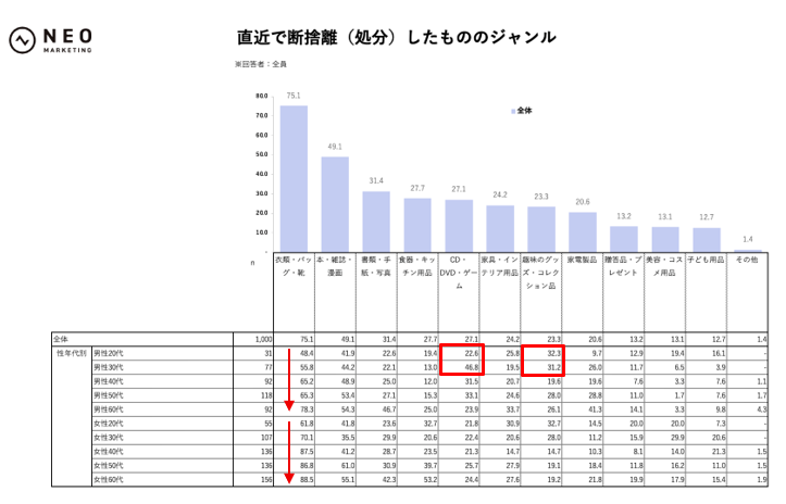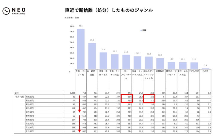 一方で若年男性は処分ジャンルがやや異なり、男性30代では「CD・DVD・ゲーム」46.8%、男性20代では「趣味のグッズ・コレクション品」32.3%が目立ちます。