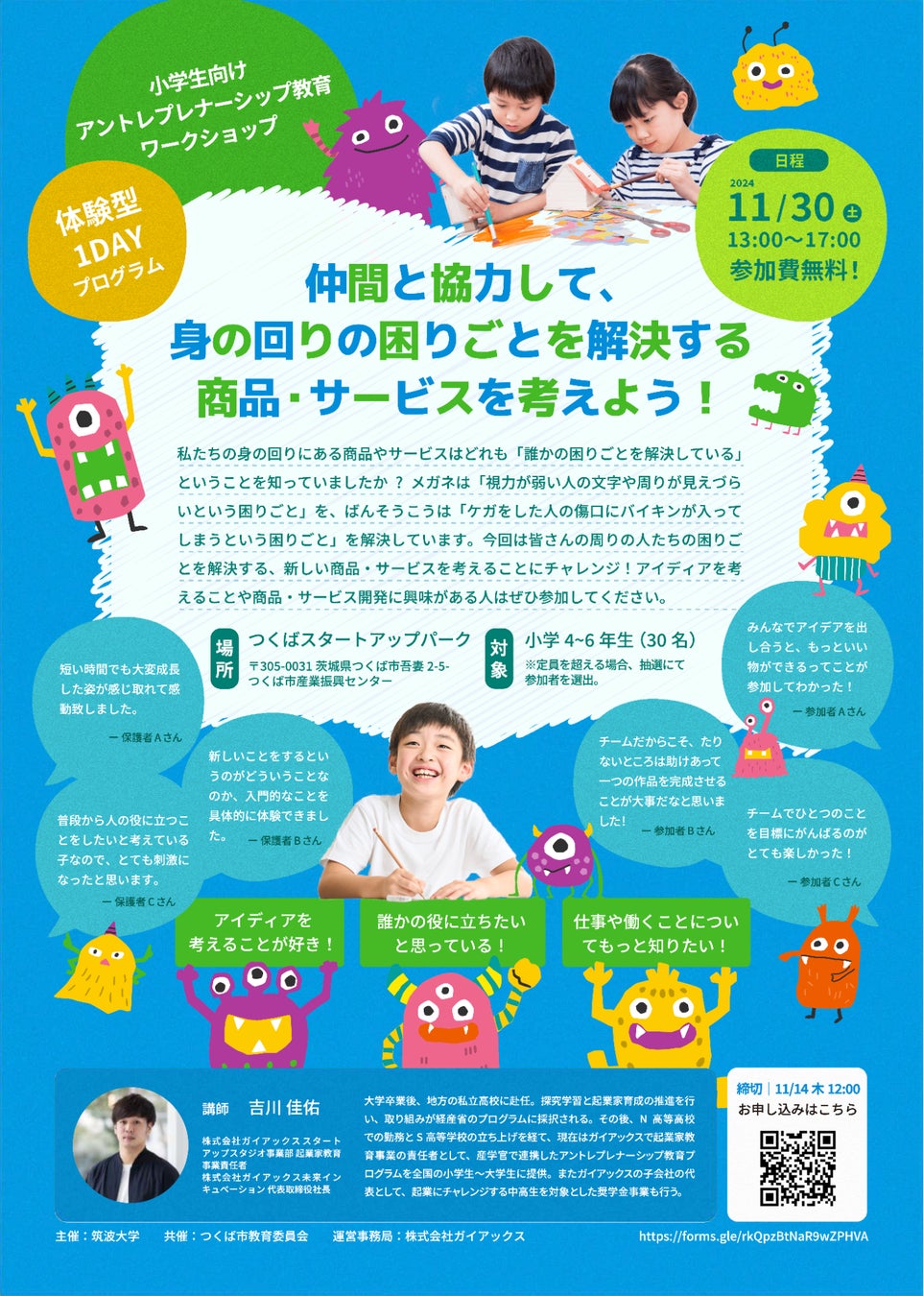 起業家教育プログラムを提供する株式会社ガイアックス(本社:東京都千代田区、代表執行役社長:上田 祐司、証券コード:3775、以下 ガイアックス)は、筑波大学・つくば市と連携し、小学生を対象に起業をテーマにしたワークショップを開催します。本ワークショップでは参加者が身の回りの困りごとの解決にチャレンジすることを通して、課題解決の方法や他者と協力する際に重要なこと、アントレプレナーシップ(※)などについて学びます。なお、当社が筑波大学・つくば市と連携して小学生向けにワークショップを行うのは、昨年度に引き続き2年連続2回目となります。