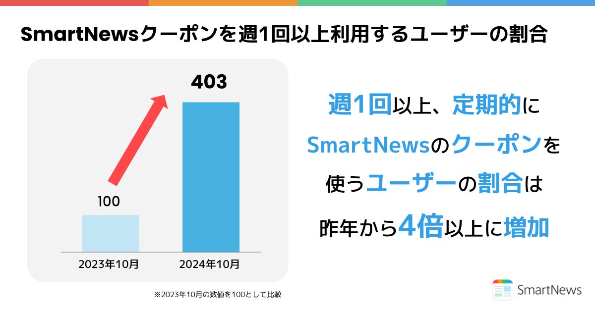 SmartNewsクーポンを週1回以上利用する人の割合は、昨年から4倍以上に急増