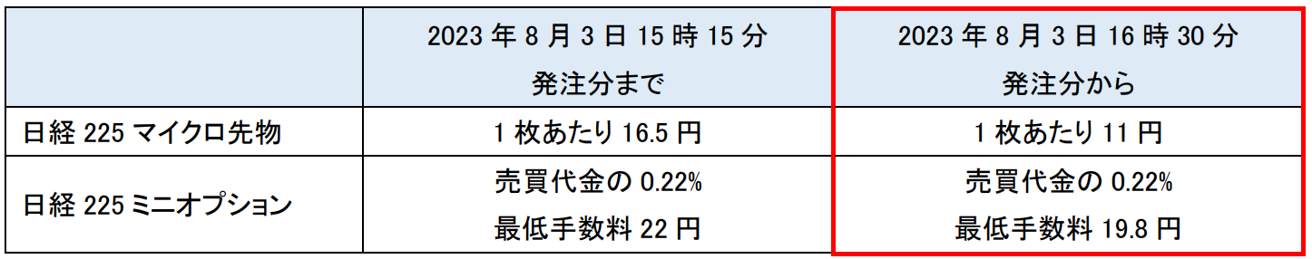 2023年8月3日(木)16時30分の夜間取引発注分より、「日経225マイクロ先物」の取引手数料を1枚あたり16.5円(税込)から1枚あたり11円(税込)に、「日経225ミニオプション」の取引手数料を売買代金の0.22%で最低手数料22円(税込)から売買代金の0.22%で最低手数料19.8円(税込)に、それぞれ手数料の引き下げを行います。