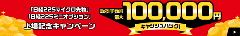 また、当社では「日経225マイクロ先物」と「日経225ミニオプション」の取引手数料を最大100,000円キャッシュバックするキャンペーンを実施中です。ぜひ、お得なこの期間に「日経225マイクロ先物」と「日経225ミニオプション」の取引をご検討ください。
