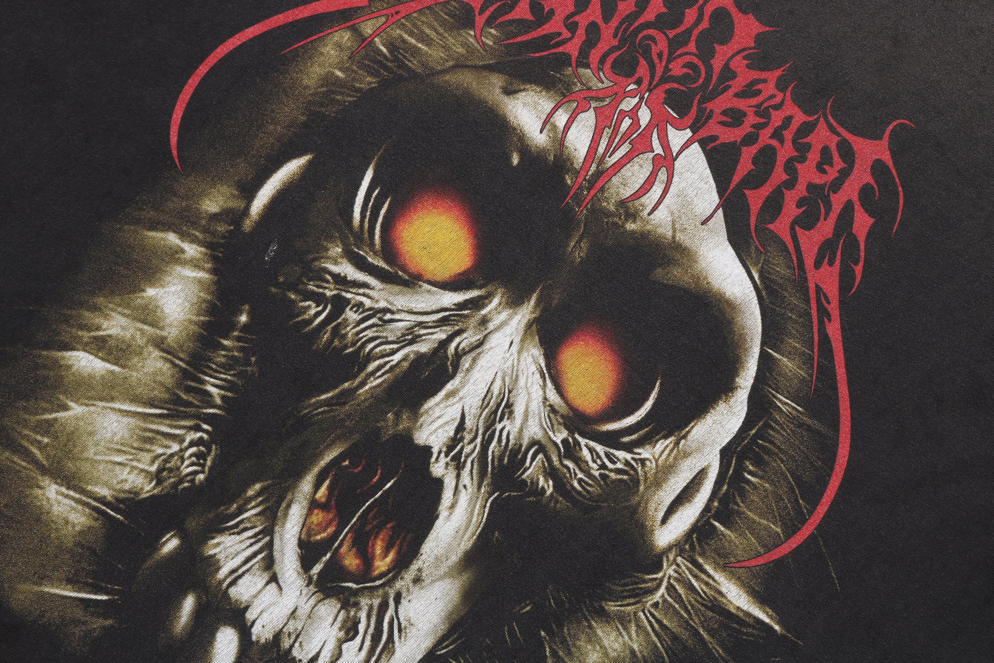 ボディには、ダメージや色落ち、プリントの自然なヒビ割れなど、©SAINT Mxxxxxxらしい細部までこだわった本格的なヴィンテージ加工を施しました。また、左袖口にはAPE HEADのピスネームをあしらい、本コレクションが特別なものであることを象徴しています。