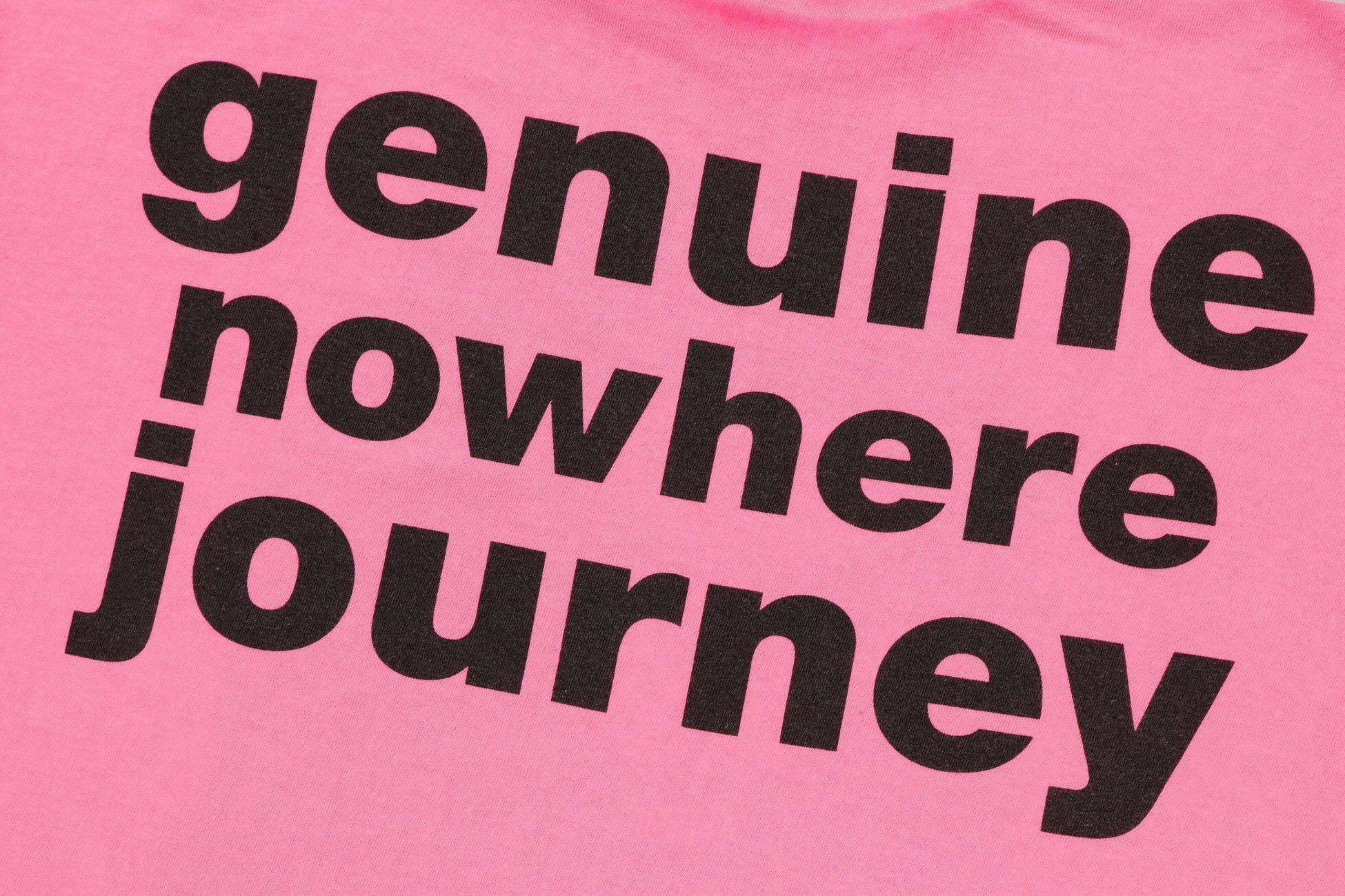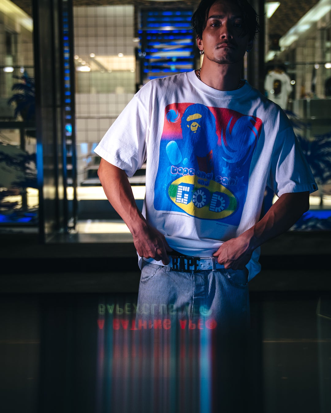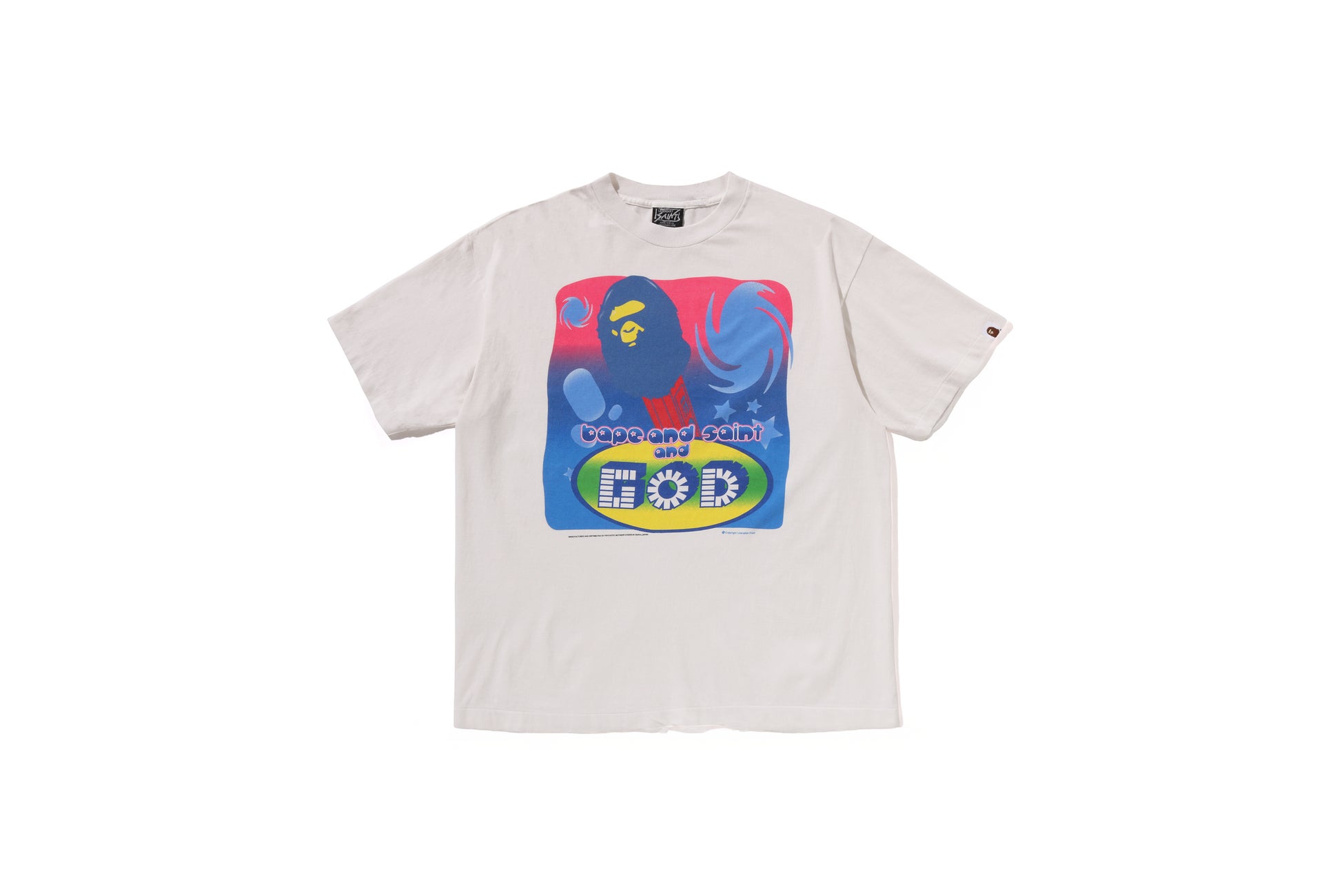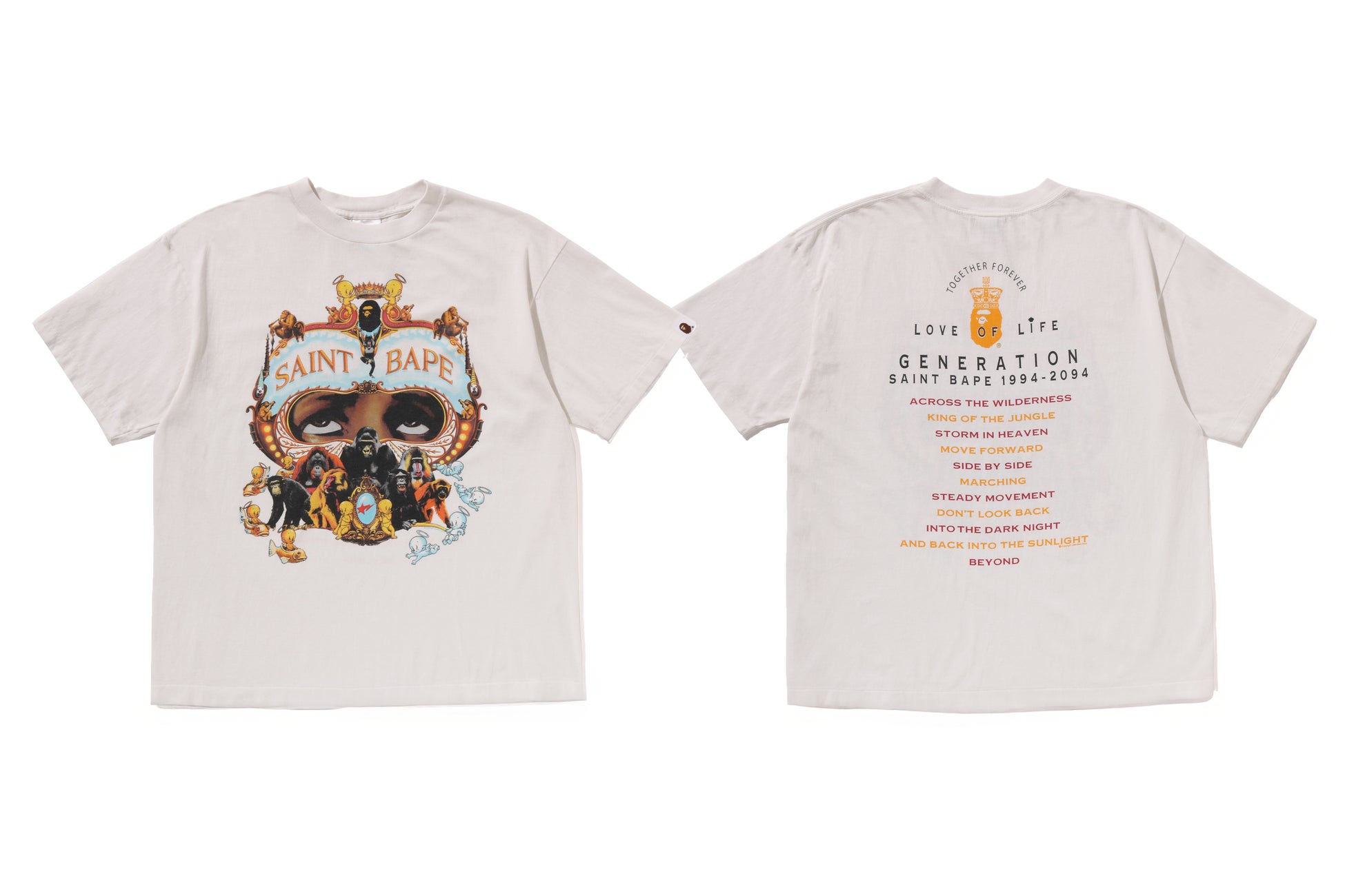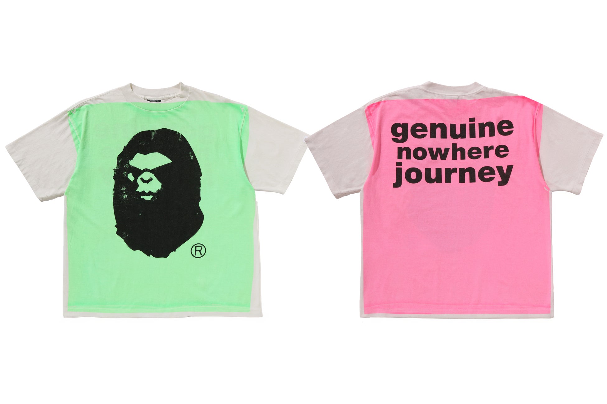 そのほか、BAPE®初期のTシャツに、ライトグリーンとピンクのネオンカラーを上から重ね、バックプリントに「genuine nowhere journey」のメッセージをあしらった一着や、APE HEADと「bape and saint and GOD」の言葉を大胆にあしらったデザインなど、多彩なアプローチで展開します。