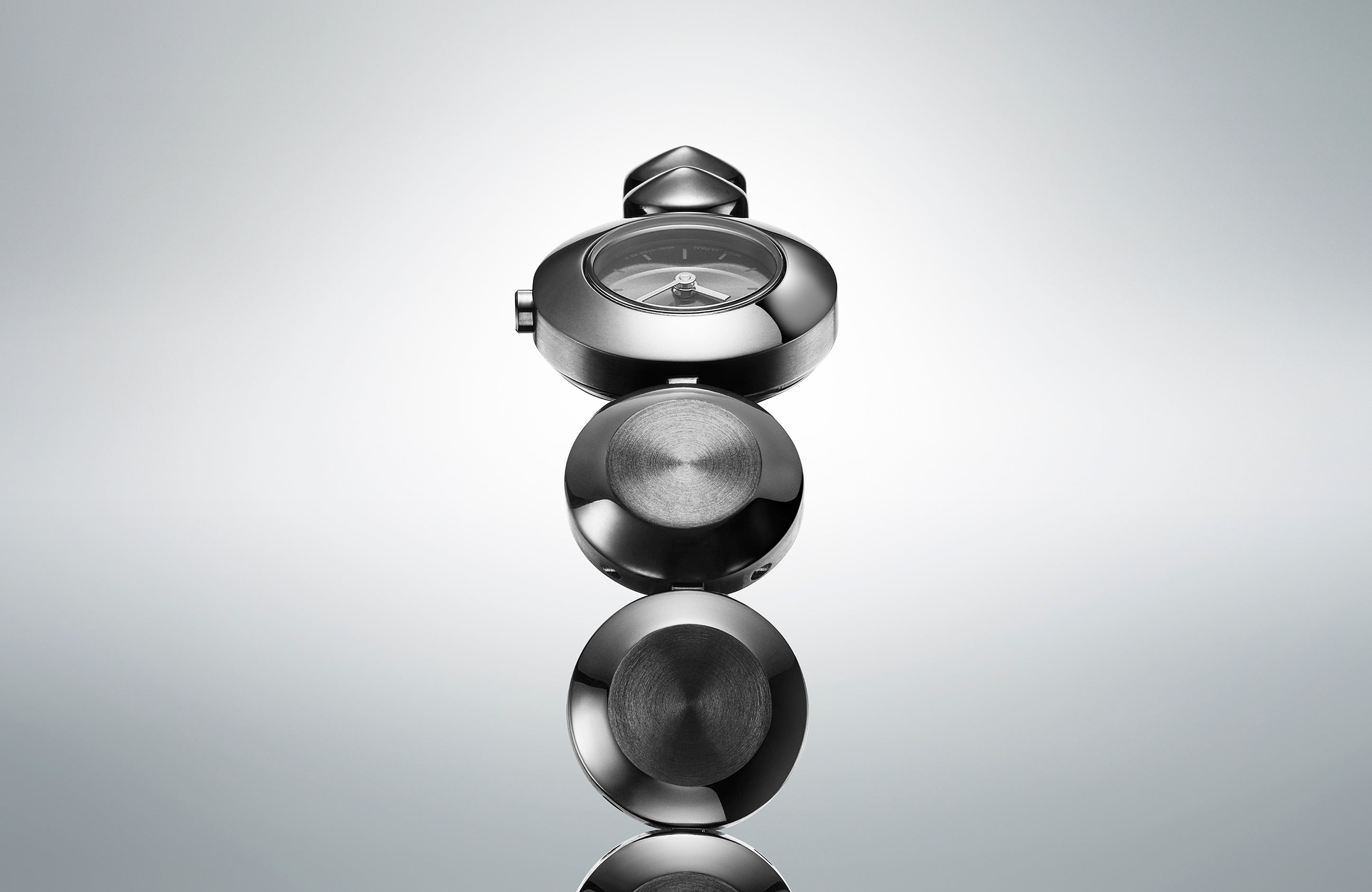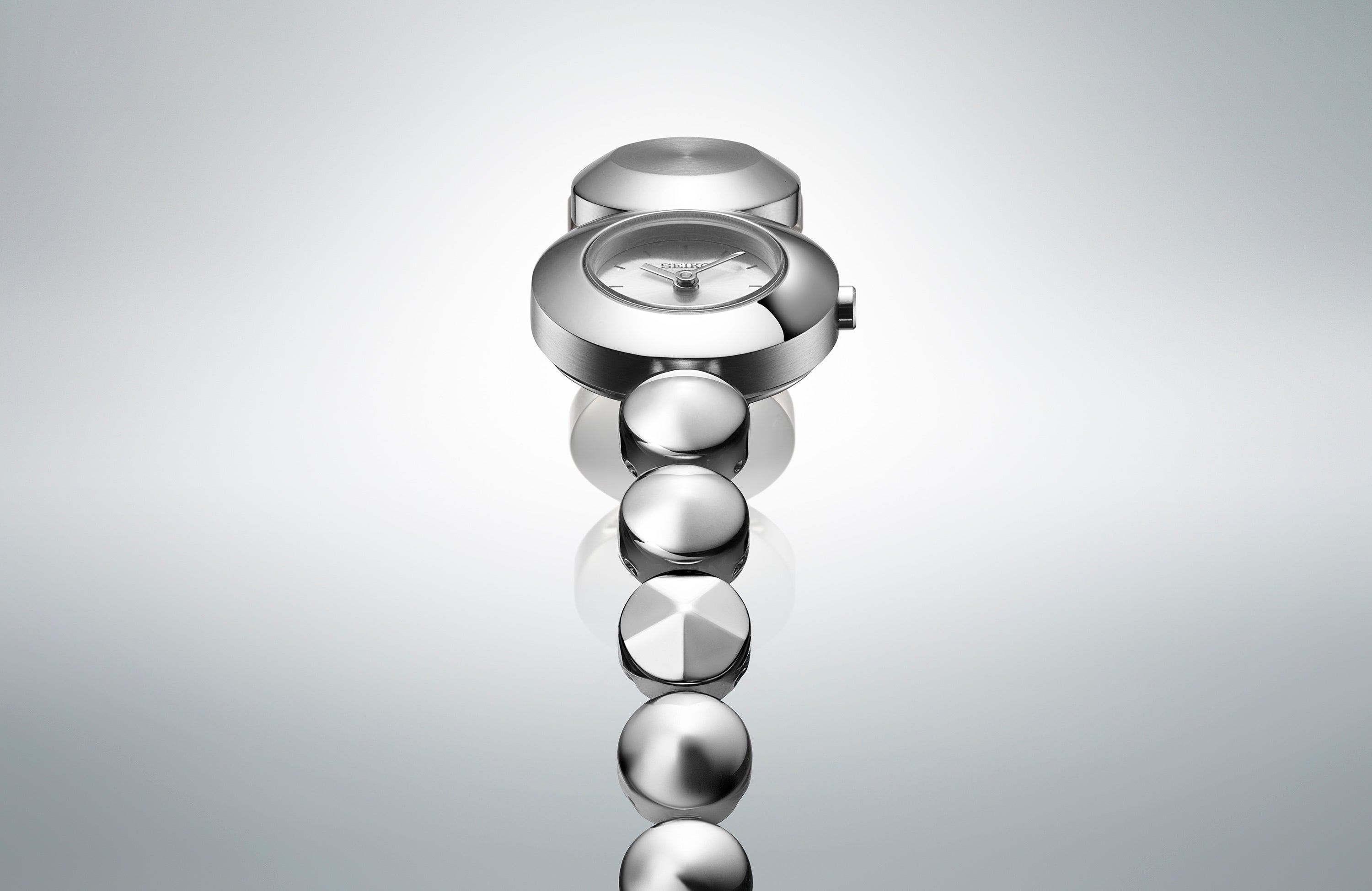 時計本体と12時側の大きな丸いこまを同じような大きさと形状に設計し、一体感を表現することで、ファッションアイテムのような軽やかさを実現。また、サイズの異なるこまを12時側と6時側で使い分けたアシンメトリーなブレスレットは、様々な価値観を内包する今の時代にふさわしい新しいスタイルを目指しました。着用した人の最も目に入りやすい、6時側から3つ目のこまだけに施された、きらりと輝く多面カットは、着ける人たちの心が高揚するような、ブレスレットらしい遊び心のあるワンポイントとしてあしらっています。