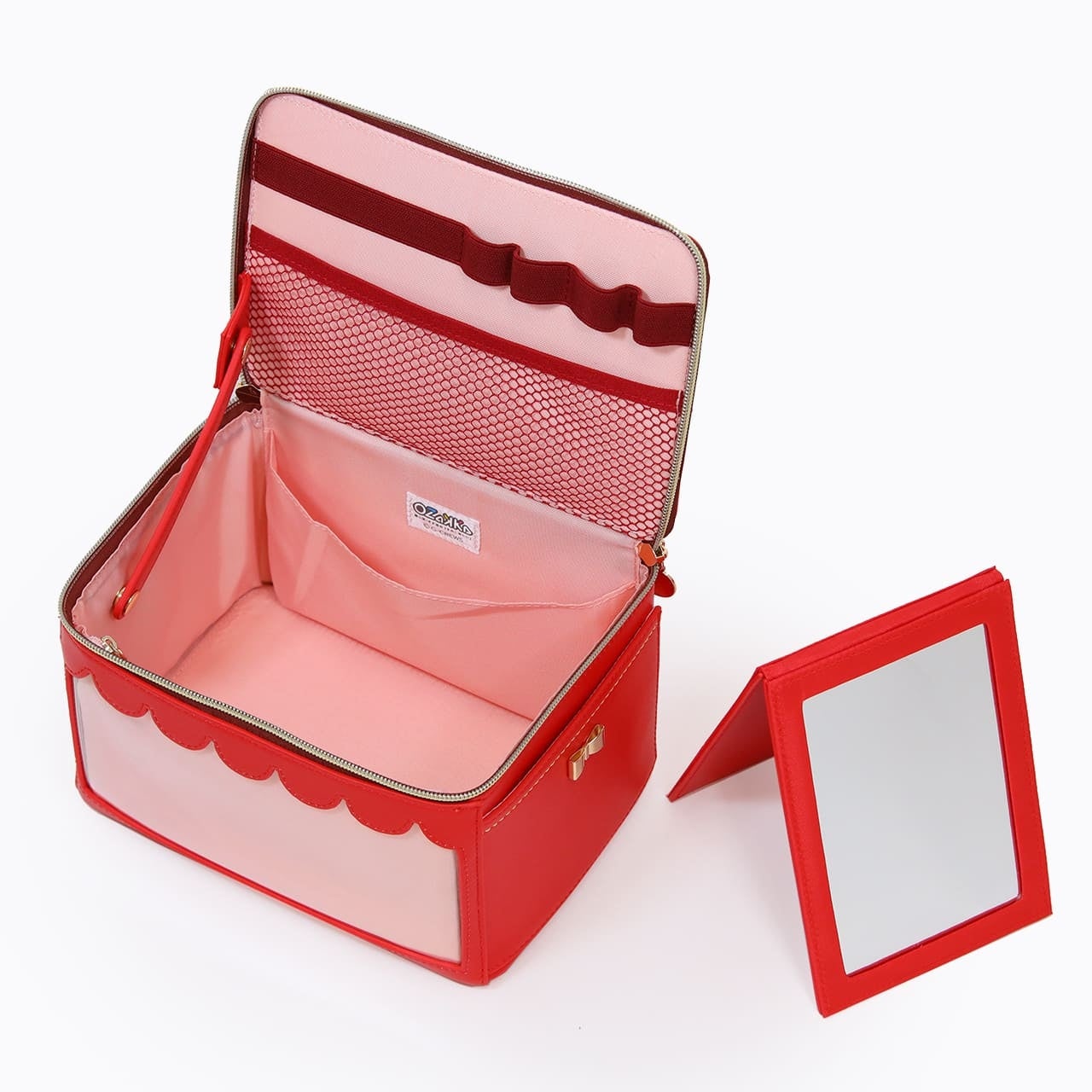 付属の二つ折りミラーはボックスの内側にあるバンドに固定できるので、ミラーを差したボックスをそのままキャリーの上に載せれば、イベント会場でもあまり場所を取ることなくキャリーの前に座ってメイクできちゃいます!