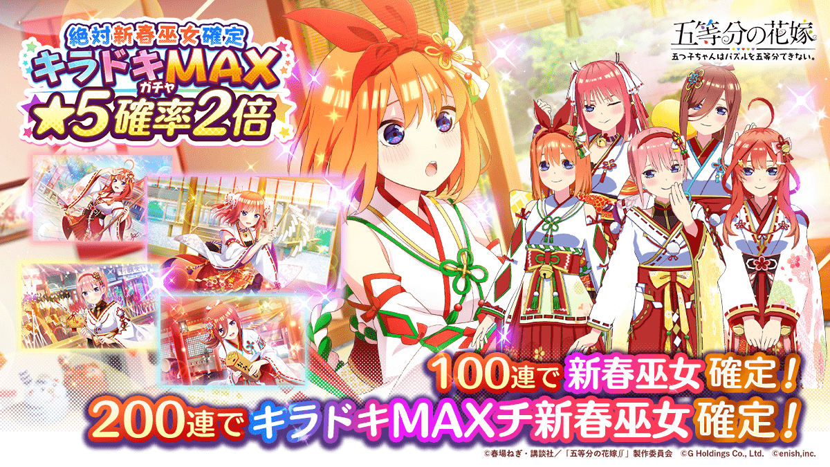 株式会社enish(本社:東京都港区、代表取締役社長:安徳 孝平、以下enish)は、2022年12月26日(月)より、アニメ「五等分の花嫁」初となるゲームアプリ『五等分の花嫁 五つ子ちゃんはパズルを五等分できない。』にて、「絶対新春巫女確定!キラドキMAXカムバックキャンペーン」を開催いたします。