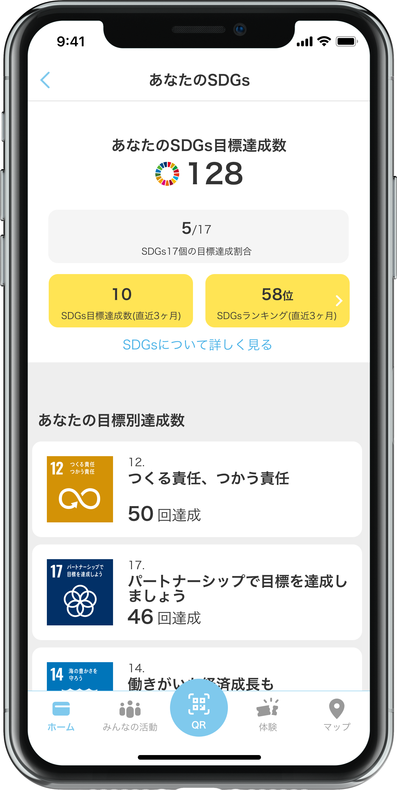 ▲自分が貢献したSDGs目標達成数がわかる画面