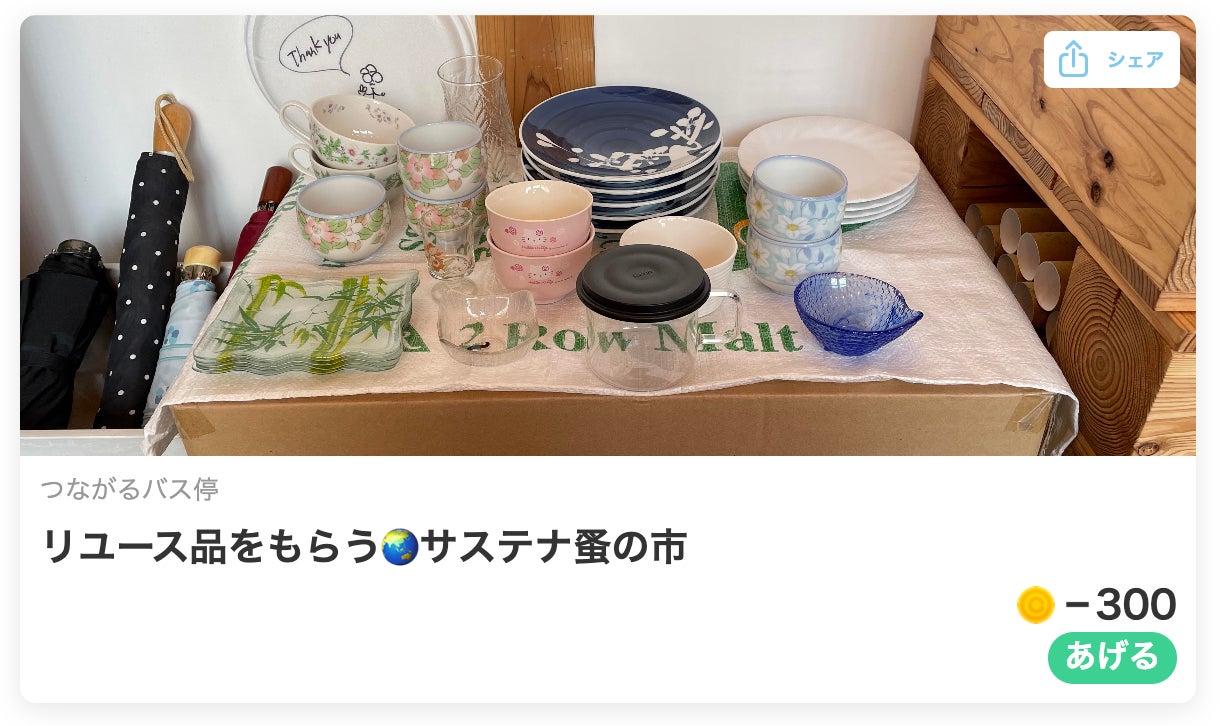 内容:関係人口創出拠点施設「つながるバス停」にてリユース品の寄付や引き取りができます。家庭で使われなくなった食器や傘などをまちのコインでもらえます。「ゴミになるのがイヤ!」「人が使わなくなったものでも十分」という、モノなありがたさと地球の叫びに耳を傾けるきっかけとなります。