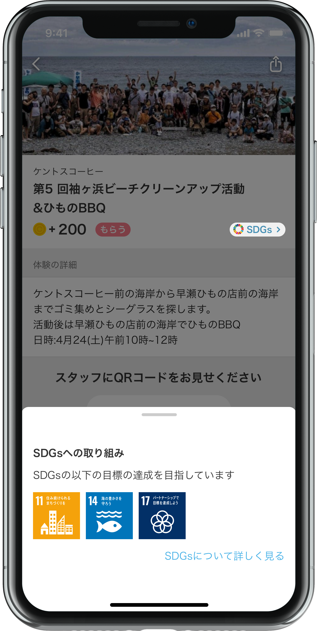 「まちのコイン」が2019年9月、神奈川県「SDGsつながりポイント事業」に採択されたことをきっかけに、当社はコインの獲得、利用がどのSDGs目標達成を目指しているかわかるようアプリを改修し、2020年2月に小田原市で初めて導入されました。例えば、ユーザーがコインを獲得できる地域の清掃活動の参加は、SDGs目標11の「住み続けられるまちづくりを」と15の「陸の豊かさを守ろう」に貢献する体験ということがわかります。また、アプリ内では、自分や地域のユーザーが貢献したSDGs目標達成数が表示される仕組みになっており、SDGsを身近に自分ごと化しやすくなっています。さらに、SDGsに貢献する体験を多くしたユーザーのランキングもアプリに表示されるので、ゲーム感覚で楽しみながら取り組めます。