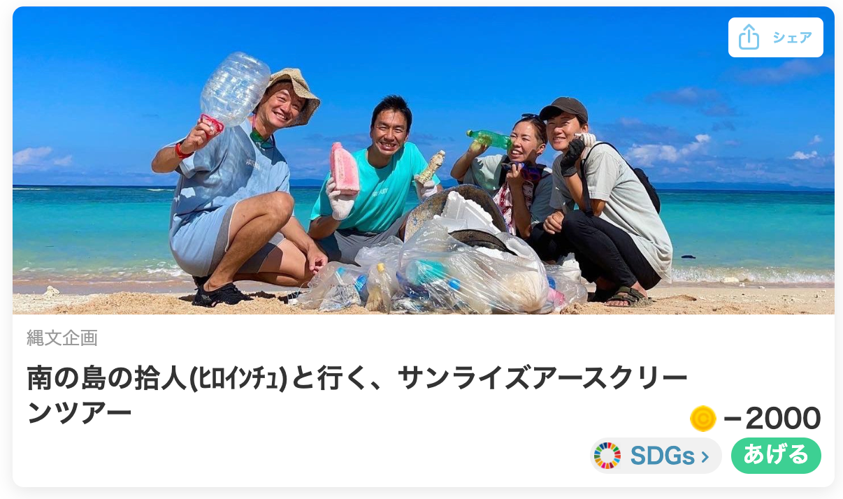 内容:石垣島で毎日アースクリーンを継続している南の島の拾人(ヒロインチュ)といくサンライズアースクリーンツアー。水平線から上がる美しいサンライズを拝み、ビーチのゴミ拾いを行う約2時間のツアーです。