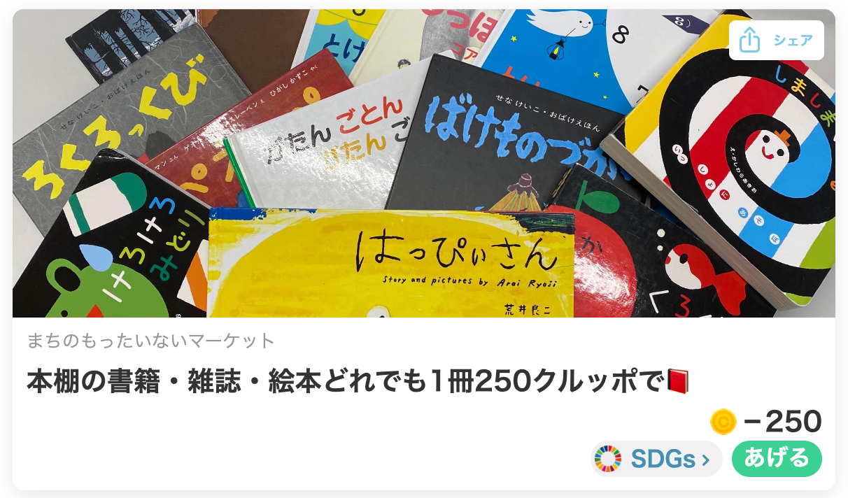内容:「誰かのもったいないが、だれかのうれしいに」をコンセプトにまちの中での資源の循環を促す「もったいないマーケット」で読書の秋にぴったりな絵本のバザー行います。同時に絵本の引き取りも行っています。