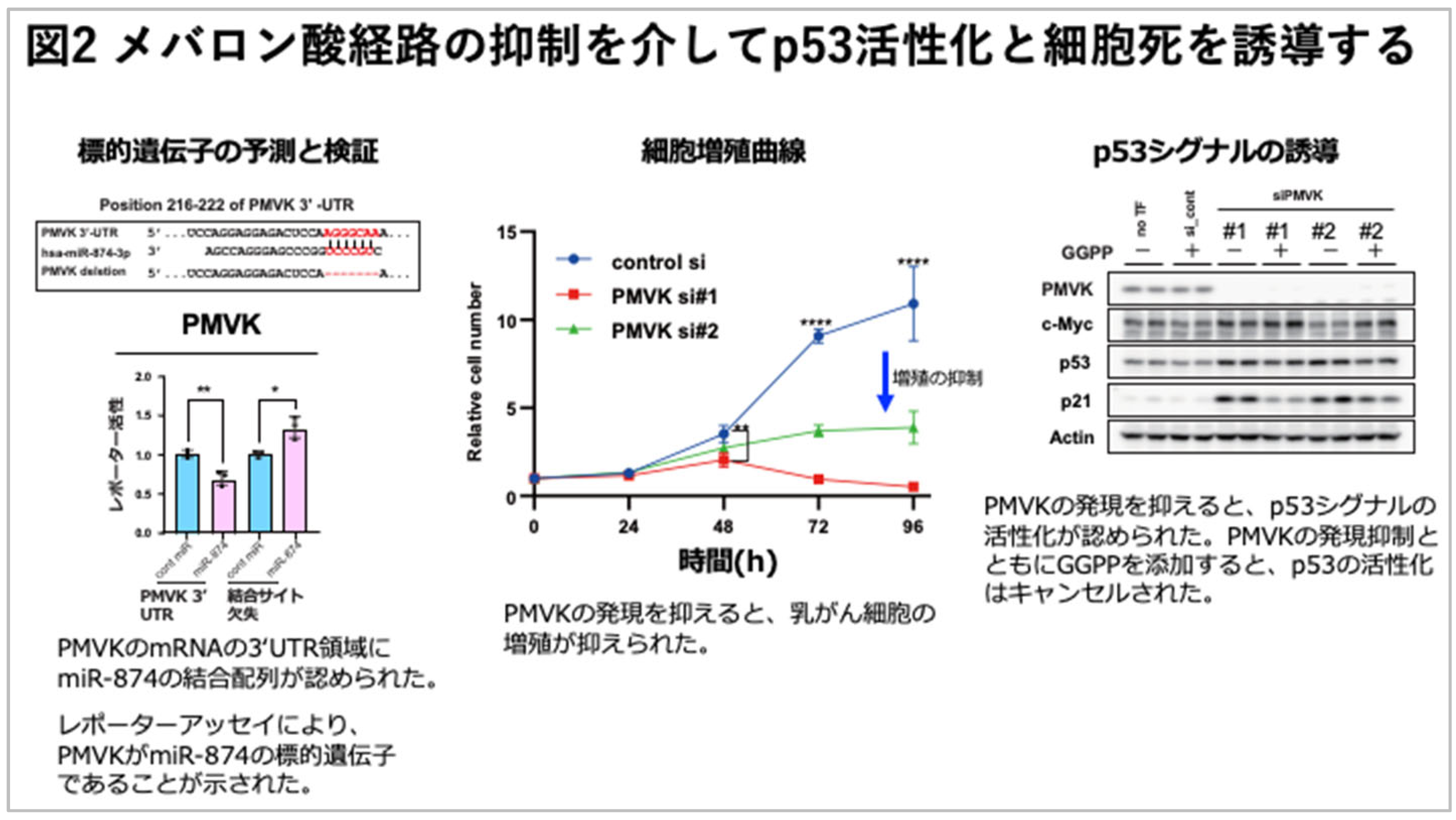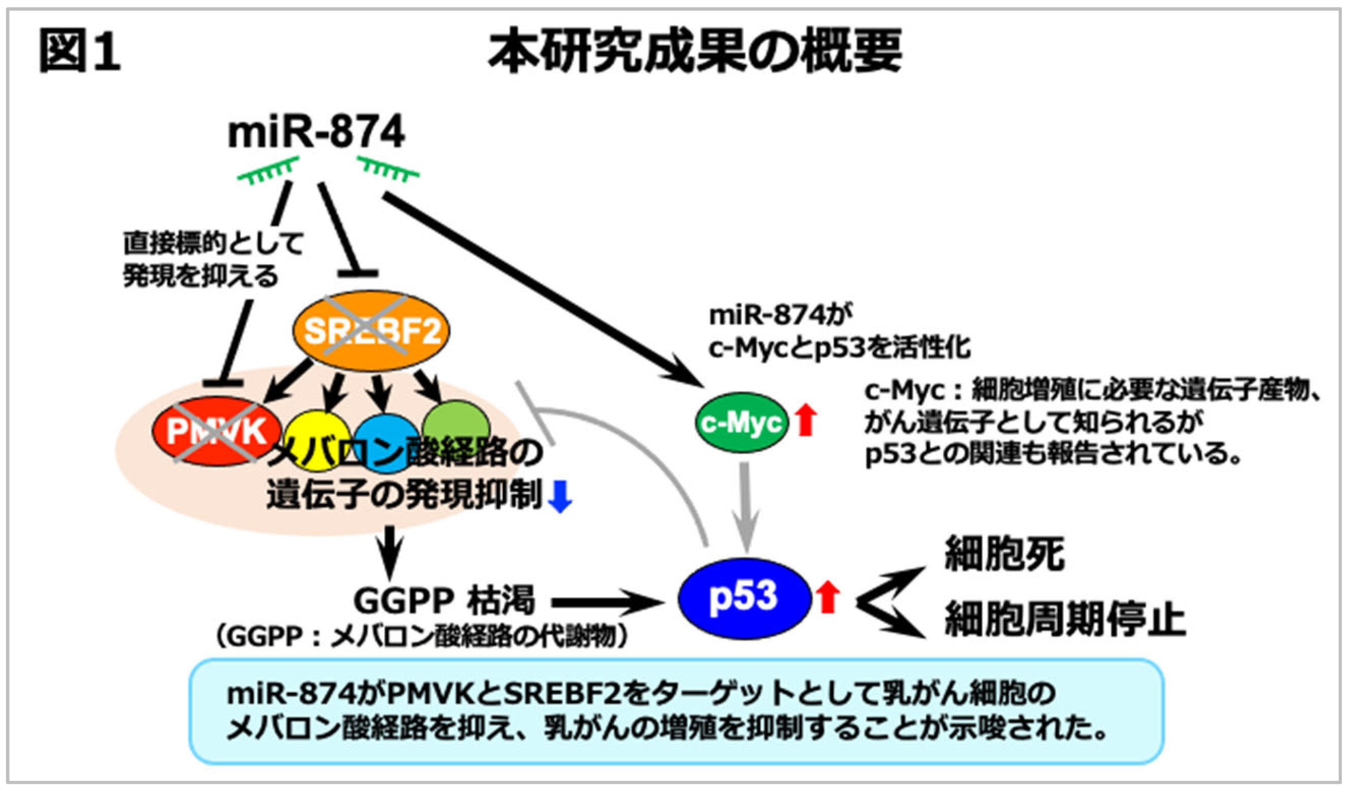 千葉大学大学院医学研究院、災害治療学研究所の橋本直子助教、田中知明教授らの研究グループは、マイクロRNA(miRNA, miR)(注1)-874が、メバロン酸経路(注2)の抑制を介して乳がん細胞の増殖を抑制するメカニズムを明らかにしました。乳がんにおけるmiR-874と細胞内代謝の関わりの解析が進むことで、乳がんに対する新たな治療法の開発が期待できます。本研究成果は、2022年11月2日、英国科学誌「Scientific Reports」に掲載されました。