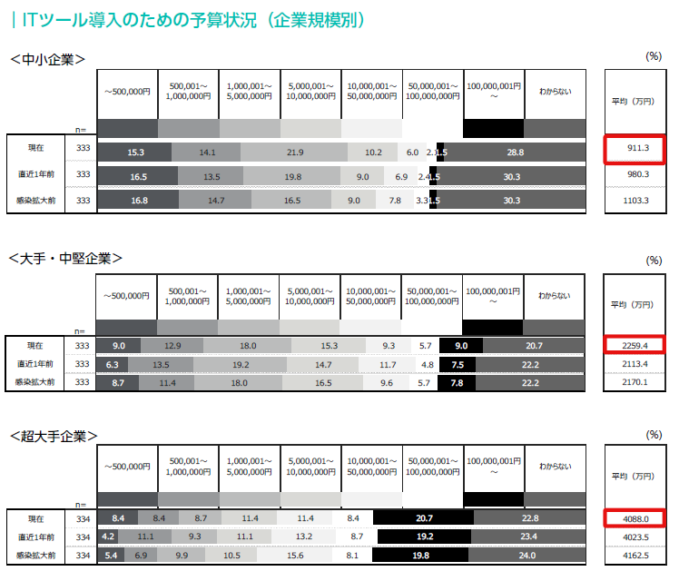 ・ITツール予算は約900~4,000万円。中小企業の予算はコロナウイルスの感染拡大以降、右肩下がりとなっている。大手・中堅企業はコロナ禍で一時減少したものの、直近1年でコロナ以前を上回る結果となった。超大手企業はコロナウイルス感染拡大以前ほどではないが直近1年で回復傾向が見られた。