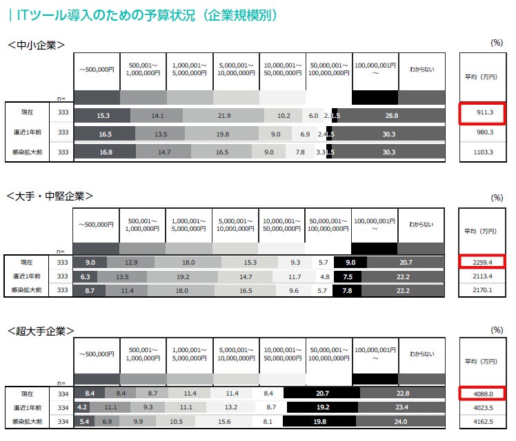 3.ITツール導入のための予算状況:中小は予算縮小、大手中堅はコロナ前水準、超大手はコロナ前に及ばず